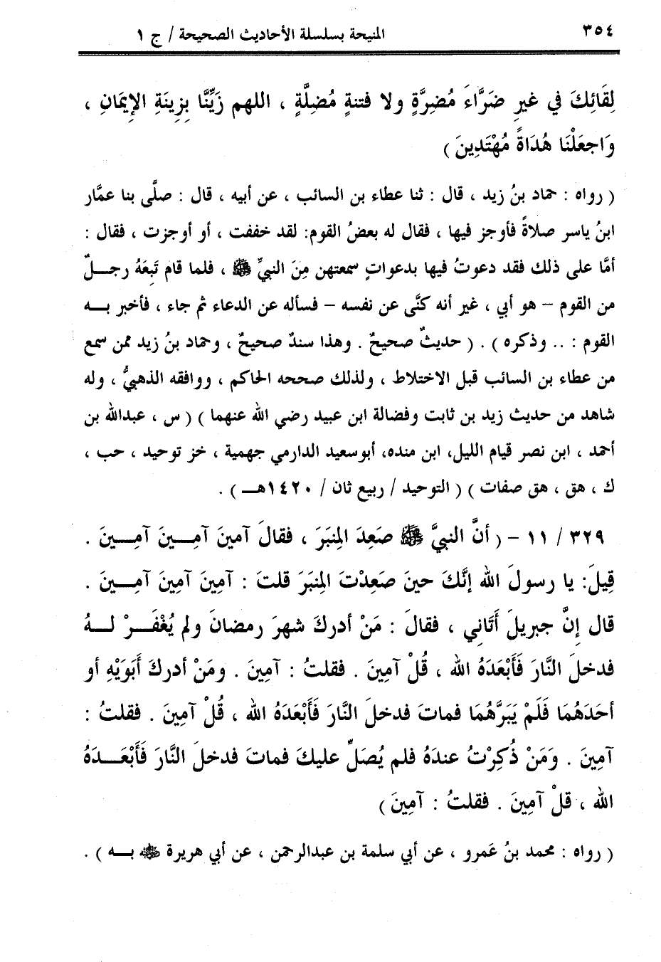 329/ 11 - (أن النبي - صلى الله عليه وسلم - صَعِدَ المِنبَرَ، فقالَ آمينَ آمِينَ آمِين.