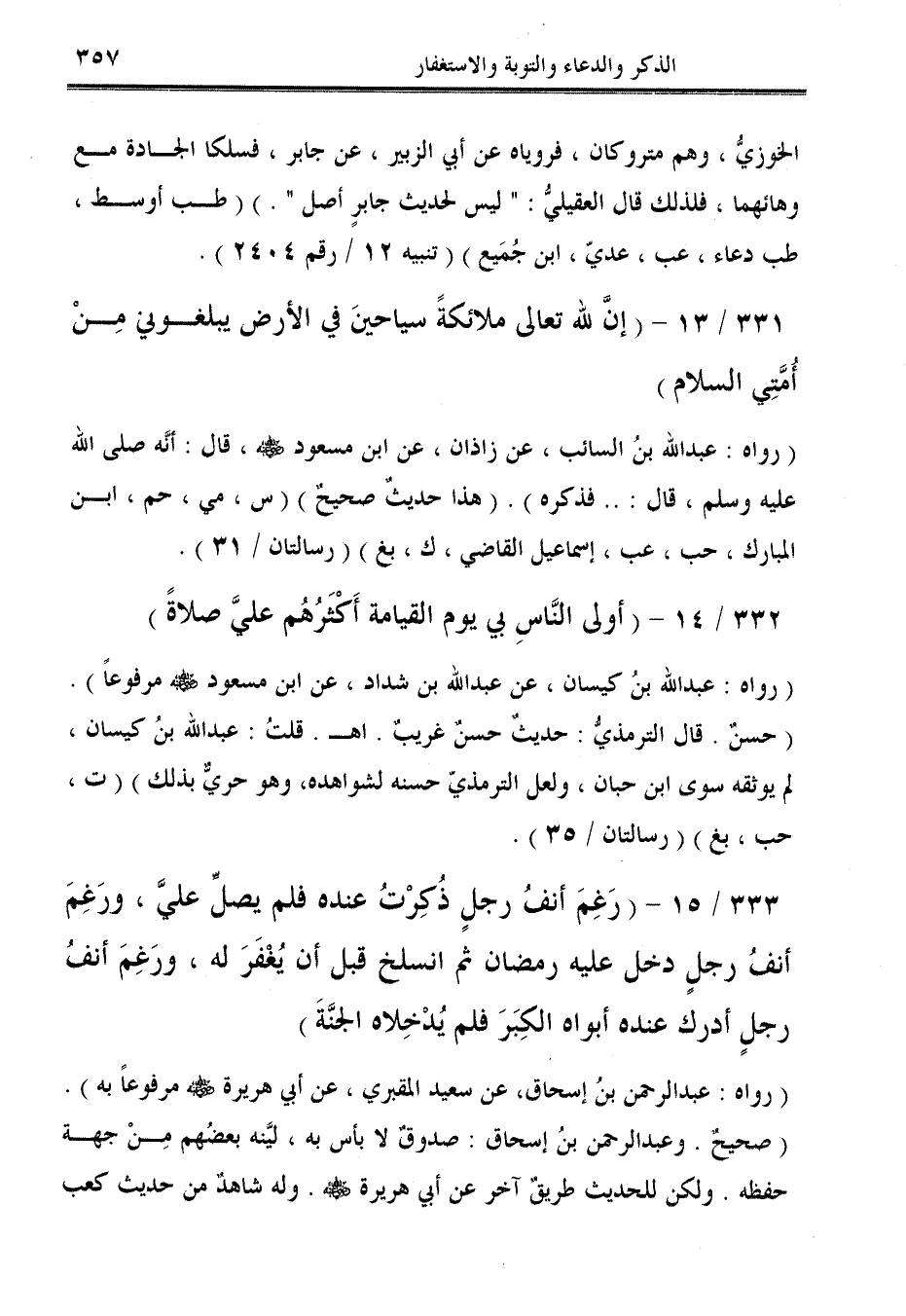 (رواه: عبد الله بنُ السائب، عن زاذان، عن ابن مسعود - رضي الله عنه -، قال: أنه صلى الله عليه وسلم، قال: .. فذكره). (هذا حديثٌ صحيح) (س، مي، حم، ابن المبارك، حب، عب، إسماعيل القاضي، ك، بغ) (رسالتان / 31).