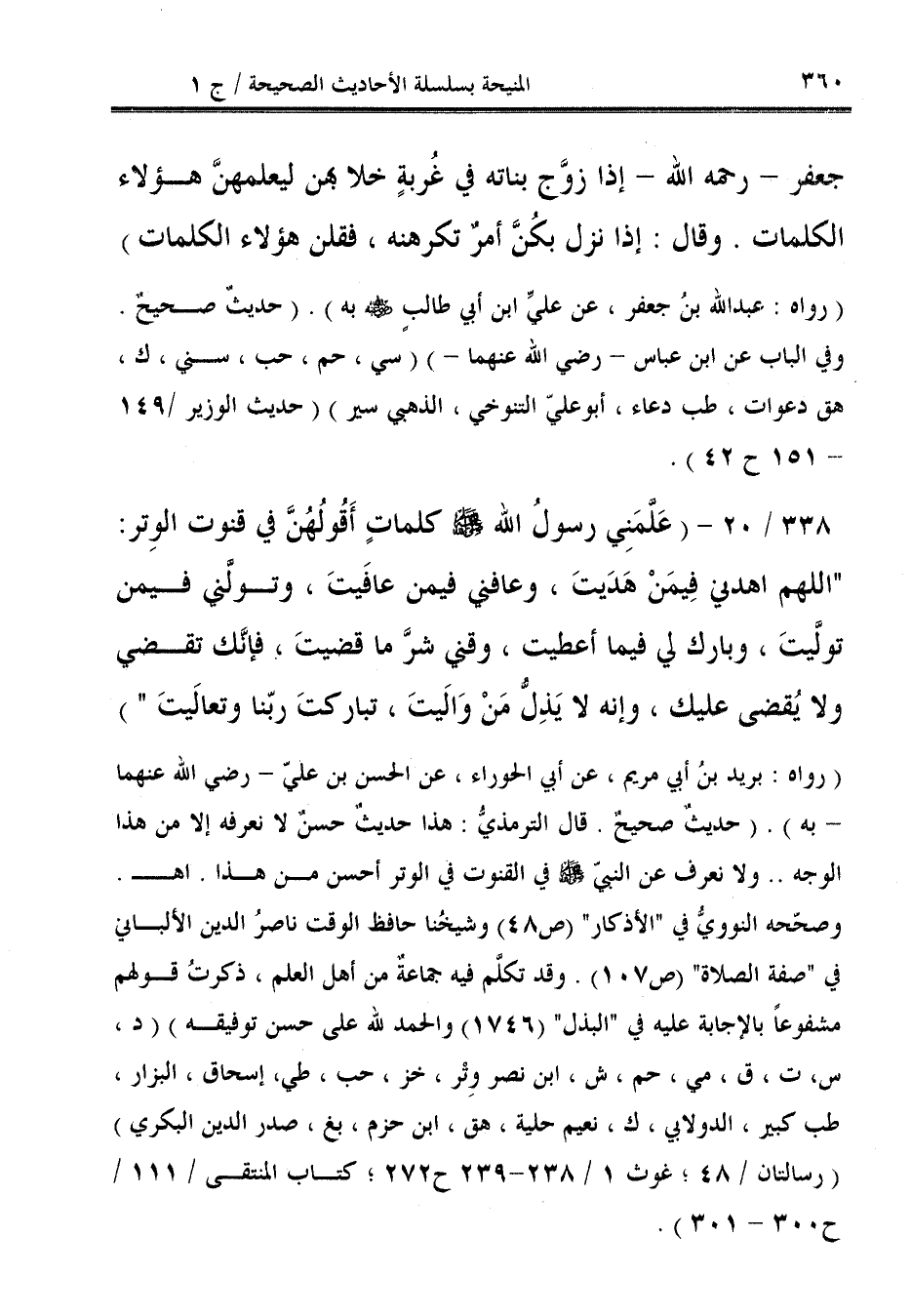 338/ 20 - (عَلَّمَني رسولُ الله - صلى الله عليه وسلم - كلماتٍ أَقولُهُنَّ في قنوت الوِتر: "اللهم اهدني فِيمَنْ هَدَيتَ، وعافني فيمن عافَيتَ، وتولني فيمن تولَّيتَ، وبارك لي فيما أعطيت، وقني شرَّ ما قضيتَ، فإنك تقضي ولا يُقضى عليك، وإنه لا يَذِلُّ مَنْ وَالَيتَ، تباركتَ ربّنا وتعالَيتَ").