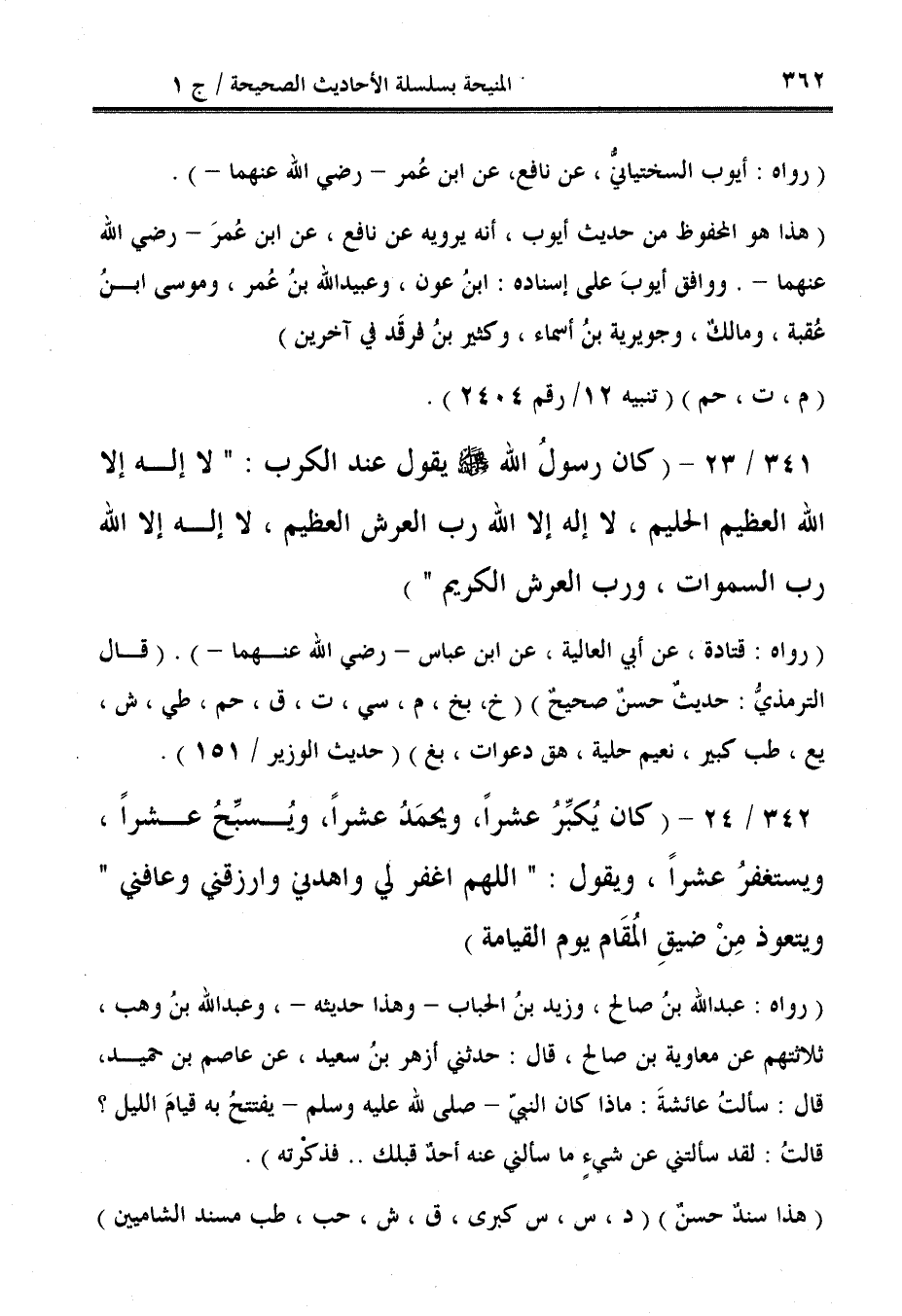 342/ 24 - (كان يُكبِّرُ عشرًا، ويحمَدُ عشرًا، ويُسبِّحُ عشرًا، ويستغفرُ عشرًا، ويقول: "اللهم اغفر لي واهدني وارزقني وعافني" ويتعوذ مِنْ ضيقِ المُقَام يوم القيامة).