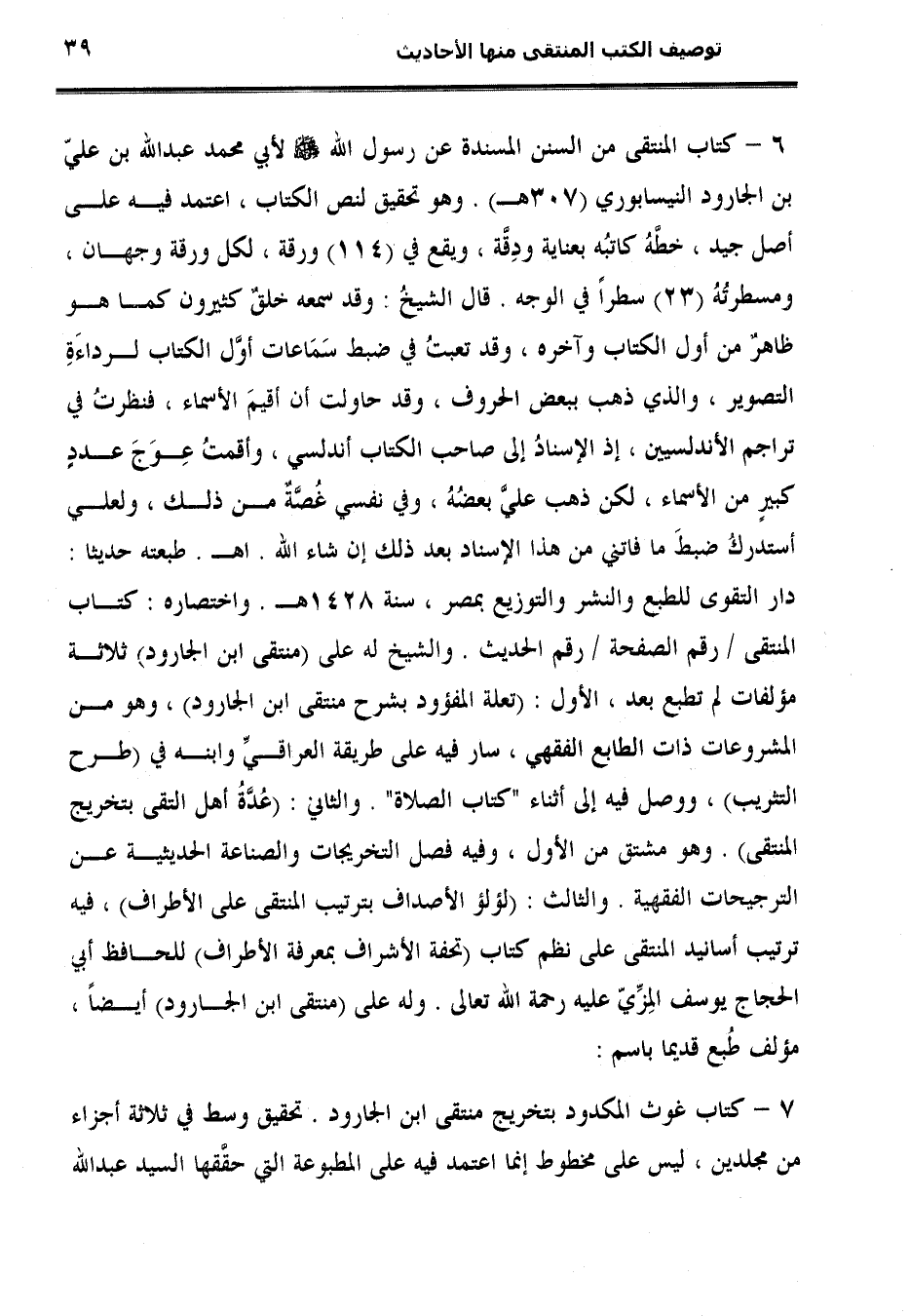 6 - كتاب المنتقى من السنن المسندة عن رسول الله - صلى الله عليه وسلم - لأبي محمد عبد الله بن عليّ بن الجارود النيسابوري (307 هـ). وهو تحقيق لنص الكتاب، اعتمد فيه على أصل جيد، خطهُ كاتبُه بعناية ودِقَّة، ويقع في (114) ورقة، لكل ورقة وجهان، ومسطرتُهُ (23) سطرًا في الوجه. قال الشيخُ: وقد سمعه خلقٌ كثيرون كما هو ظاهرٌ من أول الكتاب وآخره، وقد تعبتُ في ضبط سَمَاعات أوَّل الكتاب لرداءَةِ التصوير، والذي ذهب ببعض الحروف، وقد حاولت أن أقيمَ الأسماء، فنظرتُ في تراجم الأندلسيين، إذ الإسنادُ إلى صاحب الكتاب أندلسي، وأقمتُ عِوَجَ عددٍ كبيرٍ من الأسماء، لكن ذهب عليَّ بعضُهُ، وفي نفسي غُصَّةٌ من ذلك، ولعلي أستدركُ ضبطَ ما فاتني من هذا الإسناد بعد ذلك إن شاء الله. اهـ. طبعته حديثًا: دار التقوى للطبع والنشر والتوزيع بمصر، سنة 1428 هـ. واختصاره: كتاب المنتقى / رقم الصفحة / رقم الحديث. والشيخ له على (منتقى ابن الجارود) ثلاثة مؤلفات لم تطبع بعد، الأول: (تعلة المفؤود بشرح منتقى ابن الجارود)، وهو من المشروعات ذات الطابع الفقهي، سار فيه على طريقة العراقيَّ وابنه في (طرح التثريب)، ووصل فيه إلى أثناء "كتاب الصلاة". والثاني: (عُدَّةُ أهل التقى بتخريج المنتقى). وهو مشتق من الأول، وفيه فصل التخريجات والصناعة الحديثية عن الترجيحات الفقهية. والثالث: (لؤلؤ الأصداف بترتيب المنتقى على الأطراف)، فيه ترتيب أسانيد المنتقى على نظم كتاب (تحفة الأشراف بمعرفة الأطراف) للحافظ أبي الحجاج يوسف المِزِّيّ عليه رحمة الله تعالى. وله على (منتقى ابن الجارود) أيضًا، مؤلف طُبع قديمًا باسم: