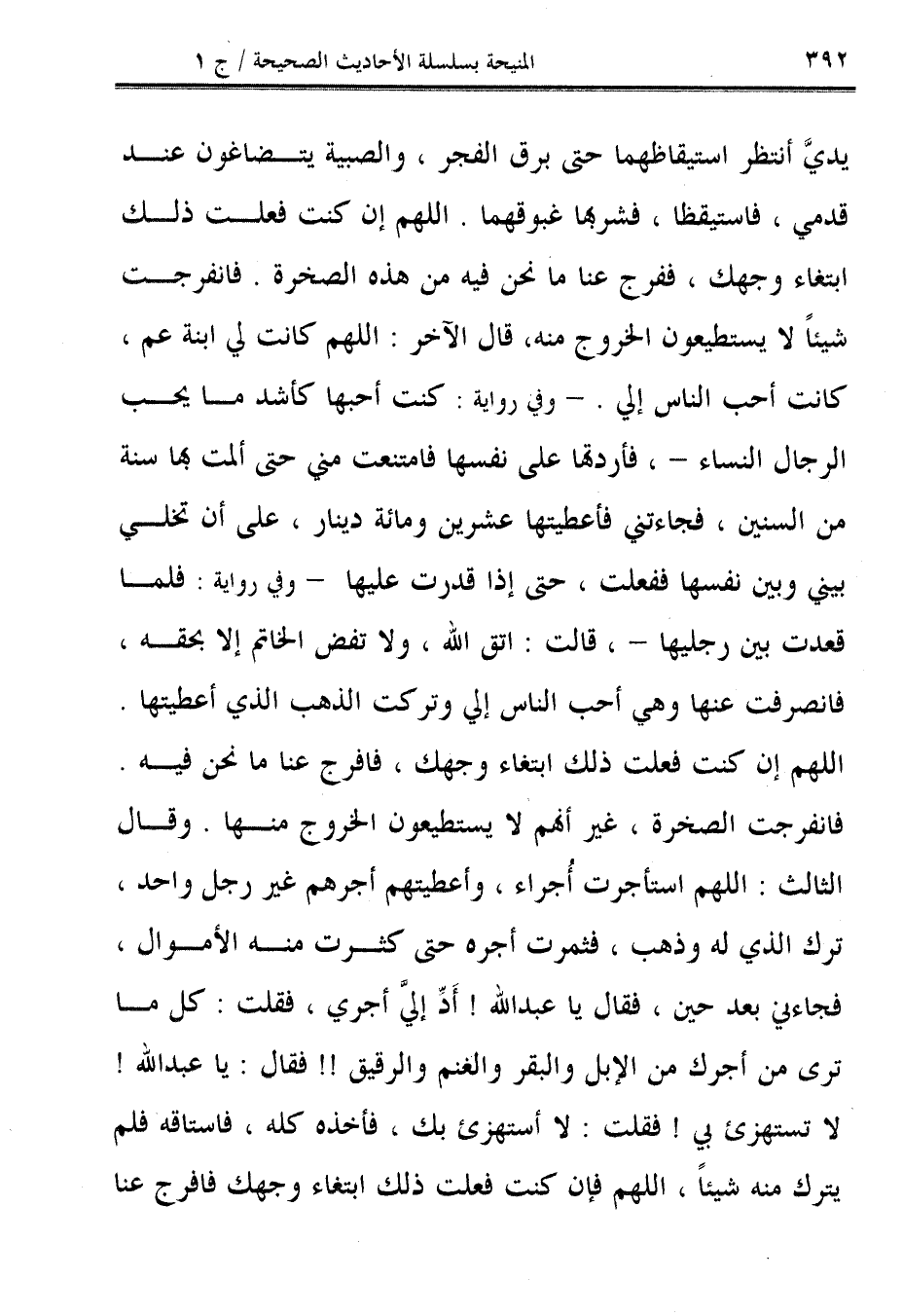 يديَّ أنتظر استيقاظهما حتى برق الفجر، والصبية يتضاغون عند قدمي، فاستيقظا، فشربها غبوقهما. اللهم إن كنت فعلت ذلك ابتغاء وجهك، ففرج عنا ما نحن فيه من هذه الصخرة. فانفرجت شيئًا لا يستطيعون الخروج منه، قال الآخر: اللهم كانت لي ابنة عم، كانت أحب الناس إلي. -وفي رواية: كنت أحبها كأشد ما يحب الرجال النساء-، فأردتها على نفسها فامتنعت مني حتى ألمت بها سنة من السنين، فجاءتني فأعطيتها عشرين ومائة دينار، على أن تخلي بيني وبين نفسها ففعلت، حتى إذا قدرت عليها -وفي رواية: فلما قعدت بين رجليها-، قالت: اتق الله، ولا تفض الخاتم إلا بحقه، فانصرفت عنها وهي أحب الناس إلي وتركت الذهب الذي أعطيتها. اللهم إن كنت فعلت ذلك ابتغاء وجهك، فافرج عنا ما نحن فيه. فانفرجت الصخرة، غير أنهم لا يستطيعون الخروج منها. وقال الثالث: اللهم استأجرت أُجراء، وأعطيتهم أجرهم غير رجل واحد، ترك الذي له وذهب، فثمرت أجره حتى كثرت منه الأموال، فجاءني بعد حين، فقال يا عبد الله! أَدِّ إليَّ أجري، فقلت: كل ما ترى من أجرك من الإبل والبقر والغنم والرقيق!! فقال: يا عبد الله! لا تستهزئ بي! فقلت: لا أستهزئ بك، فأخذه كله، فاستاقه فلم يترك منه شيئًا، اللهم فإن كنت فعلت ذلك ابتغاء وجهك فافرج عنا