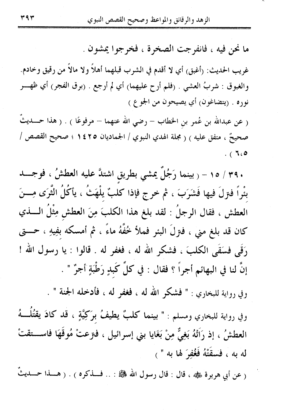 390/ 15 - (بينما رَجُلٌ يمشي بطريقٍ اشتدَّ عليه العطشُ، فوجد بِئْرًا فنزلَ فيها فَشَرَبَ، ثم خرج فإذا كلبٌ يِلْهَثُ، يأكُلُ الثَّرَى مِنَ العطش، فقال الرجلُ: لقد بلغ هذا الكلبَ مِنَ العطشِ مِثْلُ الذي كان قد بلغ مني، فنزلَ البئر فملأ خُفَّهُ ماءً، ثم أمسكه بِفِيهِ، حتى رَقَى فسَقَى الكلبَ, فشكر الله له، فغفر له. قالوا: يا رسول الله! إنَّ لنا في البهائم أجرًا؟ فقال: في كلِّ كَبِدٍ رَطْبَةٍ أجرٌ".