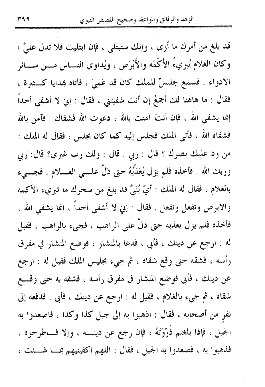 قد بلغ من أمرك ما أرى، وإنك ستبتلى، فإن ابتليت فلا تدل عليَّ وكان الغلام يُبريءُ الأَكْمَه والأَبْرَص، ويُداوي الناس من سائر الأدواء. فسمع جليسٌ للملك كان قد عَمِيَ، فأتاه بهدايا كثيرة، فقال: ما هاهنا لك أجمعُ إن أنت شفيتني، فقال: إني لا أشفي أحدًا إنما يشفي الله، فإن أنتَ آمنت بالله، دعوت الله فشفاك. فآمن بالله فشفاه الله، فأتى الملك فجلس إليه كما كان يجلس، فقال له الملك: من رد عليك بصرك؟ قال: ربي. قال: ولك رب غيري؟ قال: ربي وربك الله. فأخذه فلم يزل يُعَذِّبُهُ حتى دَلَّ على الغلام. فجيء بالغلام، ففال له الملك: أي بُنَيَّ قد بلغ من سحرك ما تبريء الأكمه والأبرص وتفعل وتفعل. فقال: إني لا أشفي أحدًا، إنما يشفي الله، فأخذه فلم يزل يعذبه حتى دلَّ على الراهب، فجيء بالراهب، فقيل له: ارجع عن دينك، فأي، فدعا بالمنشار، فوضع المنشار في مفرق رأسه، فشقه حتى وقع شقاه، ثم جيء بجليس الملك فقيل له: ارجع عن دينك، فأبى فوضع المنشار في مفرق رأسه، فشقه به حتى وقع شقاه، ثم جيء بالغلام، فقيل له: ارجع عن دينك، فأبى. فدفعه إلى نفرٍ من أصحابه، فقال: اذهبوا به إلى جبل كذا وكذا، فاصعدوا به الجبل، فإذا بلغتم ذُرْوَتَهُ، فإن رجع عن دينه، وإلا فاطرحوه، فذهبوا به، فصعدوا به الجبل، فقال: اللهم اكفينيهم بما شئت،