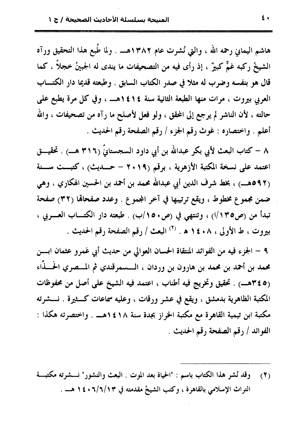 8 - كتاب البعث لأبي بكر عبد الله بن أبي داود السجستانيّ (316 هـ). تحقيق اعتمد على نسخة المكتبة الأزهرية، برقم (2019 - حديث)، كتبت سنة (592 هـ)، بخط شرف الدين أبي عبد الله محمد بن أحمد بن الحسين الهكاري، وهي ضمن مجموع مخطوط، ويقع ترتيبها في آخر المجموع. وعدد صفحاتها (32) صفحة تبدأ من (ص 135/ ا)، وتنتهي في (ص 150 /ب). طبعته دار الكتاب العربي، بيروت، ط الأولى، 1408 هـ. (¬2) البعث / رقم الصفحة رقم الحديث.