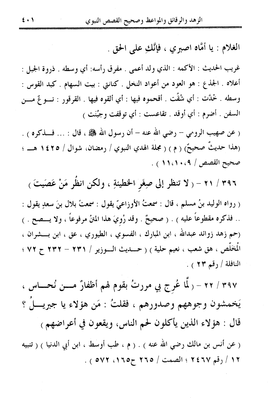 397/ 22 - (لمَّا عُرِج بي مررتُ بقوم لهم أظفارٌ من نُحاس، يَخمشون وجوههم وصدورهم، فقلتُ: مَن هؤلاء يا جبريلُ؟ قال: هؤلاء الذين يأكلون لحم الناس، ويقعون في أعراضهم).