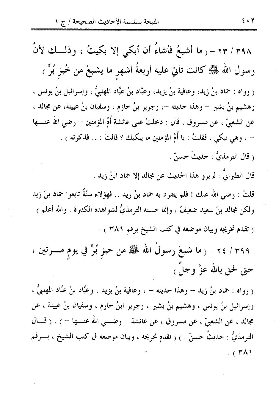 (رواه: حماد بنُ زيد -وهذا حديثه-، وعافية بنُ يزيد، وعبَّاد بنُ عبَّاد المهلبيُّ، وإسرائيل بنُ يونس، وهشيم بنُ بشير، وجرير ابنُ حازم، وسفيان بنُ عيينة، عن مجالد، عن الشعبي، عن مسروق، عن عائشة - رضي الله عنها -). (قال الترمذيُّ: حديثٌ حسنٌ.) (تقدم تخريجه، وبيان موضعه في كتب الشيخ، برقم 381).