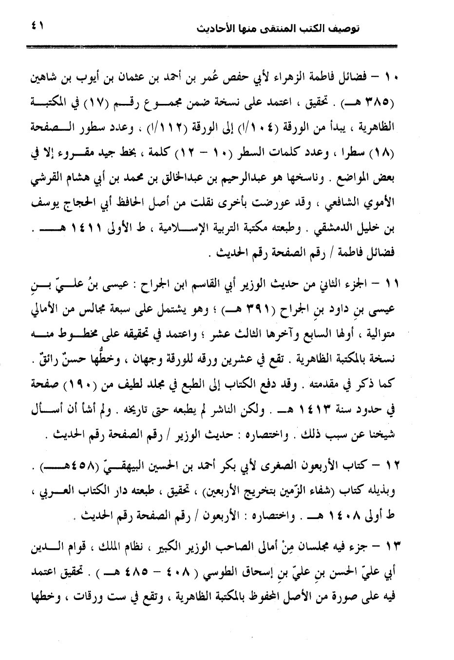 13 - جزء فيه مجلسان مِنْ أمالي الصاحب الوزير الكبير, نظام الملك, قوام الدين أبي عليّ الحسن بنِ عليّ بنِ إسحاق الطوسي (408 - 485 هـ). تحقيق اعتمد فيه على صورة من الأصل المحفوظ بالمكتبة الظاهرية، وتقع في ست ورقات، وخطها
