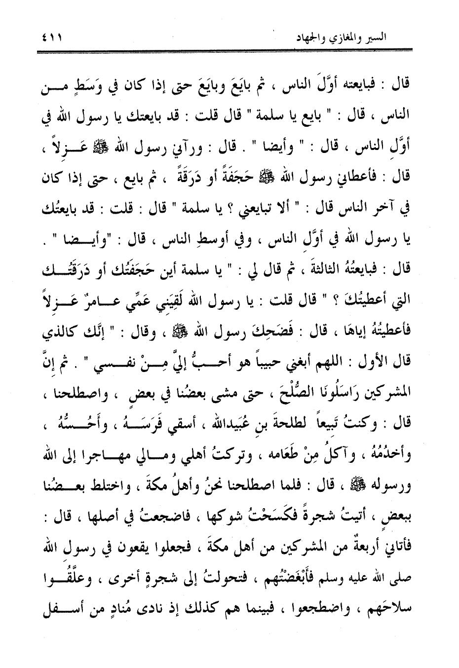 قال: فبايعته أوَّلَ الناس، ثم بايَعَ وبايَعَ حتى إذا كان في وَسَطٍ من الناس، قال: "بايع يا سلمة" قال قلت: قد بايعتك يا رسول الله في أوَّلِ الناس، قال: "وأيضًا". قال: ورآني رسول الله - صلى الله عليه وسلم - عَزِلًا، قال: فأعطاني رسول الله - صلى الله عليه وسلم - حَجَفَةً أو دَرَقَةً، ثم بايع، حتى إذا كان في آخر الناس قال: "ألا تبايعني؟ يا سلمة" قال: قلت: قد بايعتُك يا رسول الله في أوَّلِ الناس، وفي أوسطِ الناس، قال: "وأيضًا". قال: فبايعتُهُ الثالثةَ، ثم قال لي: "يا سلمة أين حَجَفَتُك أو دَرَقَتُك التي أعطيتُكَ؟ " قال قلت: يا رسول الله لَقِيَنِي عَمِّي عامرٌ عَزِلًا فأعطيتُهُ إياهَا، قال: فَضَحِكَ رسول الله - صلى الله عليه وسلم -، وقال: "إنَّك كالذي قال الأول: اللهم أبغني حبيبًا هو أحبُّ إليَّ مِنْ نفسي". ثم إِنَّ المشركين رَاسَلُونَا الصُّلْحَ، حتى مشى بعضُنا في بعض، واصطلحنا، قال: وكنتُ تَبِيعًا لطلحةَ بنِ عُبَيد الله، أسقي فَرَسَهُ، وأَحُسُّهُ، وأخدُمُهُ، وآكلُ مِنْ طَعَامه، وتركتُ أهلي ومالي مهاجرا إلى الله ورسوله - صلى الله عليه وسلم -، قال: فلما اصطلحنا نحنُ وأهلُ مكةَ، واختلط بعضُنا ببعضٍ، أتيتُ شجرةً فكَسَحْتُ شوكها، فاضجعتُ في أصلها، قال: فأتاني أربعةٌ من المشركين من أهل مكةَ، فجعلوا يقعون في رسولِ الله صلى الله عليه وسلم فأَبْغَضْتُهم، فتحولتُ إلى شجرةٍ أخرى، وعلَّقُوا سلاحَهم، واضطجعوا، فبينما هم كذلك إذ نادى مُنادٍ من أسفل