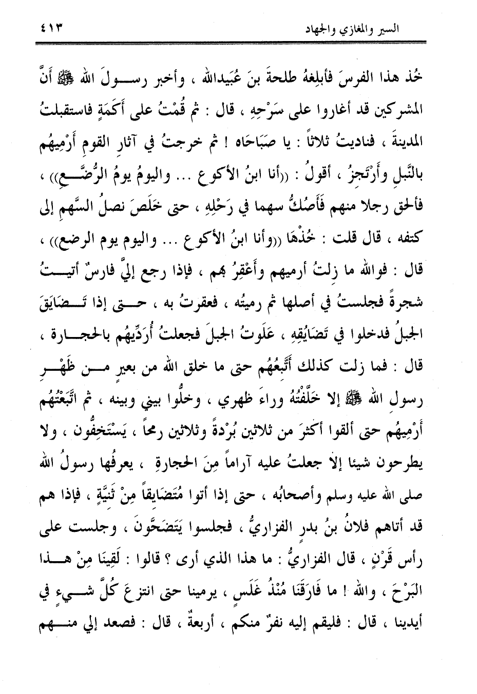 خُذ هذا الفرسَ فأبلِغهُ طلحةَ بنَ عُبَيد الله، وأخبر رسولَ الله - صلى الله عليه وسلم - أَنَّ المشركين قد أغاروا على سَرْحِهِ، قال: ثم قُمْتُ على أَكَمَةٍ فاستقبلتُ المدينةَ، فناديتُ ثلاثًا: يا صَبَاحَاه! ثم خرجتُ في آثارِ القومِ أَرْمِيهُم بالنَّبلِ وأَرْتَجِزُ، أقولُ: "أنا ابنُ الأكوع ... واليومُ يومُ الرُّضَّعِ"، فألحق رجلا منهم فَأَصُكُّ سهما في رَحْلِهِ، حتى خَلَصَ نصلُ السَّهمِ إلى كتفه، قال قلت: خُذهَا "وأنا ابنُ الأكوع ... واليوم يوم الرضع"، قال: فوالله في زِلتُ أرميهم وأَعْقِرُ بهم، فإذا رجع إليَّ فارسٌ أتيتُ شجرةً فجَلستُ في أصلها ثم رميتُه، فعقرتُ به، حتى إذا تَضَايَقَ الجبلُ فدخلوا في تَضَايُقِهِ، عَلَوتُ الجبلَ فجعلتُ أُرَدِّيهُم بالحجارة، قال: فما زلت كذلك أَتَّبِعُهُم حتى ما خلق الله من بعيرٍ من ظَهْرِ رسول الله - صلى الله عليه وسلم - إلا خَلَّفْتُهُ وراءَ ظهري، وخلُّوا بيني وبينه، ثم اتَّبَعْتُهُم أَرْمِيهُم خط ألقوا أكثرَ من ثلاثين بُرْدةً وثلاثين رمحًا، يَسْتَحفُّون، ولا يطرحون شيئًا إلَّا جعلتُ عليَه آرامًا مِنَ الحجارةِ، يعرفها رسولُ الله صلى الله عليه وسلم وأصحابُه، حتى إذا أتوا مُتَضَايِقًا مِنْ ثَنِيَّةٍ، فإذا هم قد أتاهم فلانُ بنُ بدرٍ الفزاريُّ، فجلسوا يَتَضَحَّون، وجلست عن رأس قَرْنٍ، قال الفزاريُّ: ما هذا الذي أرى؟ قالوا: لَقِينا مِنْ هذا البَرْحَ، والله! ما فَارَقَنَا مُنْذُ غَلَسٍ، يرمينا حتى انتزعَ كُلّ شيءٍ في أيدينا، قال: فليقم إليه نفرٌ منكم، أربعةٌ، قال: فصعد إلي منهم