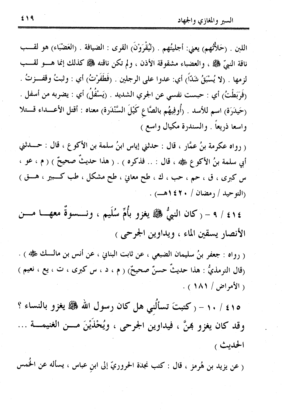 414/ 9 - (كان النبيُّ - صلى الله عليه وسلم - يغزو بأُمِّ سُلَيم، ونسوةٌ معها من الأنصار يسقين الماء، ويداوين الجرحى).