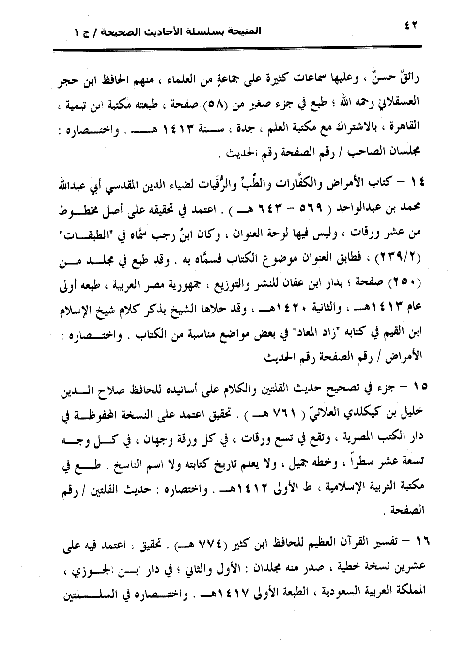 14 - كتاب الأمراض والكفَّارات والطِّبِّ والرُّقَيات لضياء الدين المقدسي أبي عبد الله محمد بن عبد الواحد (569 - 643 هـ). اعتمد في تحقيقه على أصل مخطوط من عشر ورقات، وليس فيها لوحة العنوان، وكان ابنُ رجب سمَّاه في "الطبقات" (2/ 239)، فطابق العنوان موضوع الكتاب فسمَّاه به. وقد طبع في مجلد من (250) صفحة؛ بدار ابن عفان للنشر والتوزيع، جمهورية مصر العربية، طبعه أولى عام 1413 هـ، والثانية 1420 هـ، وقد حلاها الشيخ بذكر كلام شيخ الإسلام ابن القيم في كتابه "زاد المعاد" في بعض مواضع مناسبة من الكتاب. واختصاره: الأمراض / رقم الصفحة رقم الحديث.