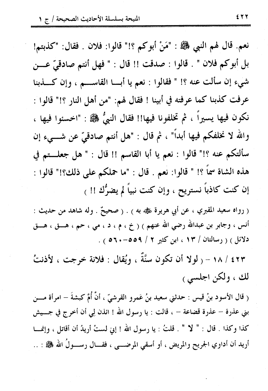 423/ 18 - (لولا أن تكون سنَّةٌ، ويُقال: فلانة خرجت، لأذنتُ لك، ولكن اجلسي).