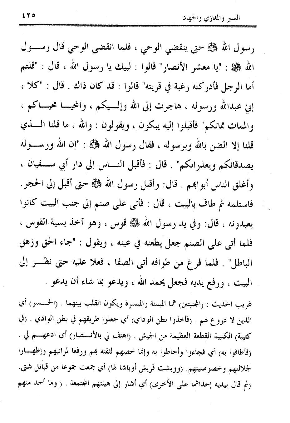 غريب الحديث: (المجنبتين) هما الميمنة والميسرة ويكون القلب بينهما. (الحسر) أي الذين لا دروع لهم. (فأخذوا بطن الوداي) أي جعلوا طريقهم في بطن الوادي. (في كتيبة) الكتيبة القطعة العظيمة من الجيش. (اهتف لي بالأنصار) أي ادعهم لي. (فأطافوا به) أي فجاءوا وأحاطوا به وإنما خصهم لثقته بهم ورفعا لمراتبهم وإظهارا لجلالتهم وخصوصيتهم. (ووبشت قريش أوباشا لها) أي جمعت جموعا من قبائل شتى. (ثم قال بيديه إحداهما على الأخرى) أي أشار إلى هيئتهم المجتمعة. (وما أحد منهم