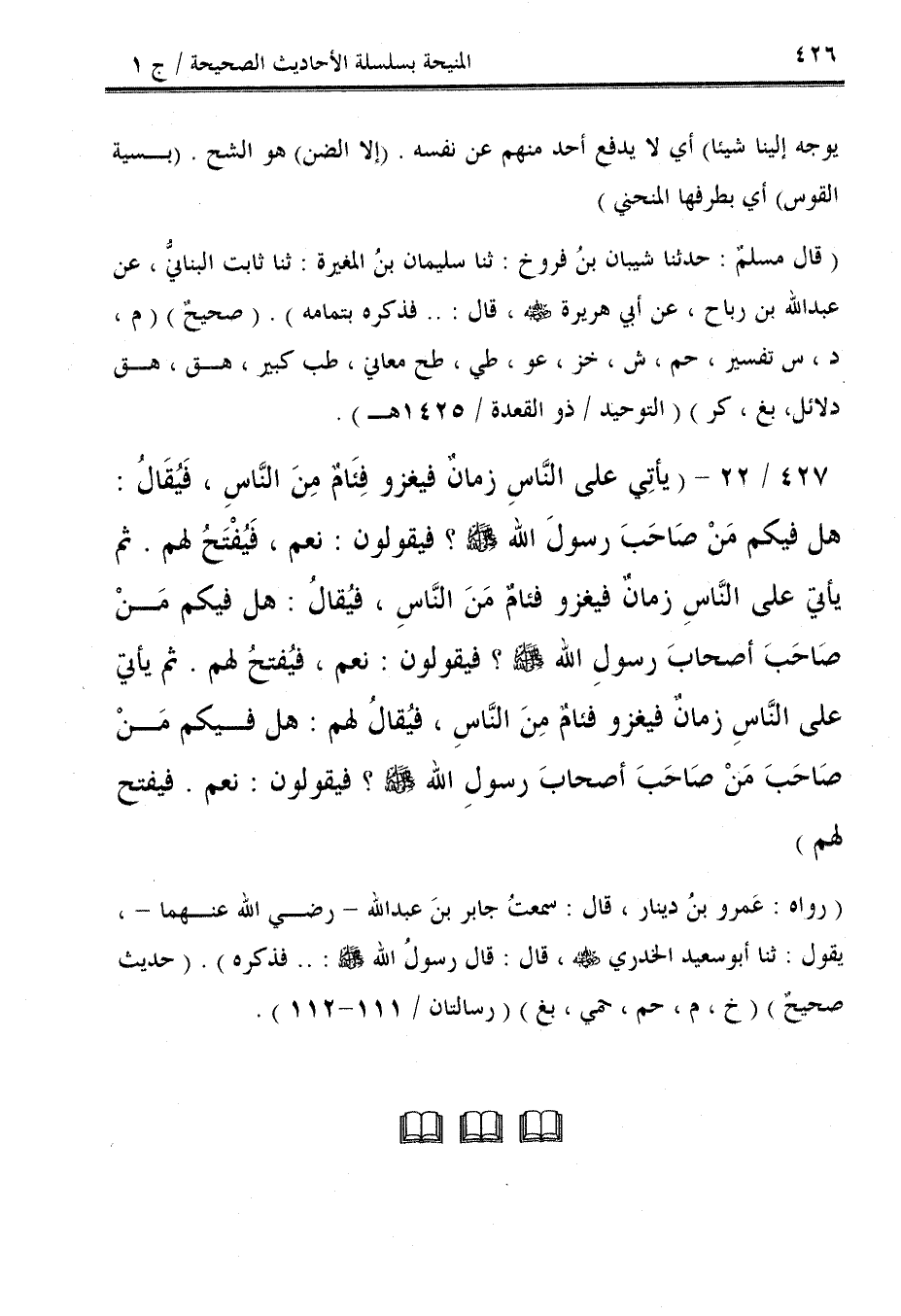 427/ 22 - (يأتِي على النَّاسِ زمانٌ فيغزو فِئَامٌ مِنَ النَّاسِ، فَيُقَالُ: هل فيكم مَنْ صَاحَبَ رسولَ الله - صلى الله عليه وسلم -؟ فيقولون: نعم، فَيُفْتَحُ لهم. ثم يأتي على النَّاسِ زمانٌ فيغزو فئامٌ مَنَ النَّاسِ، فيُقالُ: هل فيكم مَنْ صَاحَبَ أصحابَ رسولِ الله - صلى الله عليه وسلم - فيقولون: نعم، فيُفتحُ لهم. ثم يأتي على النَّاسِ زمانٌ فيغزو فئامٌ مِنَ النَّاسِ، فيُقالُ لهم: هل فيكم مَنْ صَاحَبَ مَنْ صَاحَبَ أصحابَ رسولِ الله - صلى الله عليه وسلم -؟ فيقولون: نعم. فيفتح لهم).
