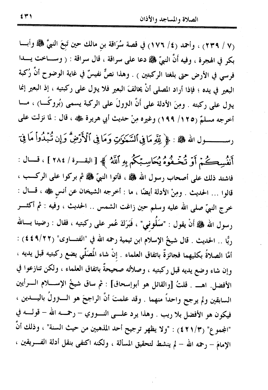 (7/ 239)، وأحمد (4/ 176) في قصة سُرَاقة بنِ مالك حين تَبِعَ النبيّ - صلى الله عليه وسلم - وأبا بكر في الهجرة، وفيه أَنَّ النبيّ - صلى الله عليه وسلم - دعا على سراقة، قال سراقة: (وساخت يدا فرسي في الأرض حتى بلغتا الركبتين). وهذا نصٌّ نفيسٌ في غاية الوضوح أنَّ رُكبة البعير في يده؛ فإذا أراد المصلي أنْ يخالفَ البعير فلا ينزل على ركبتيه، إذ البعير إنما ينزل على ركبته. ومِنَ الأدلة على أَنَّ النزولَ على الركبة يسمى (بُروكًا)، ما أخرجه مسلمٌ (125/ 199) وغيره مِنْ حديث أبي هريرة - رضي الله عنه -، قال: لما نزلت على رسول الله - صلى الله عليه وسلم -: {لِلَّهِ مَا فِي السَّمَاوَاتِ وَمَا فِي الْأَرْضِ وَإِنْ تُبْدُوا مَا فِي أَنْفُسِكُمْ أَوْ تُخْفُوهُ يُحَاسِبْكُمْ بِهِ اللَّهُ} [البقرة / 284]، قال: فاشتد ذلك على أصحاب رسول الله - صلى الله عليه وسلم -، فأتوا النبيّ ثم بركوا على الركب قالوا ... الحديث. ومِنَ الأدلة أيضًا، ما: أخرجه الشيخان عن أنسٍ - رضي الله عنه -، قال: خرج النبيّ صلى الله عليه وسلم حين زاغت الشمس .. الحديث، وفيه: ثم أكثر رسول الله - صلى الله عليه وسلم - أَنْ يقول: "سَلُونِي"، فَبَرَكَ عُمر على ركبتيه، فقال: رضينا بالله ربًّا .. الحديث. قال شيخُ الإسلام ابن تيمية رحمه الله في "الفتاوى" (22/ 449): أمَّا الصلاةُ بكليهما فجائزةٌ باتفاق العلماء. إِنْ شاء المُصَلِّي يضع ركبتيه قبل يديه، وإن شاء وضع يديه قبل ركبتيه، وصلاتُه صحيحةٌ باتفاق العلماء، ولكن تنازعوا في الأفضل. اهـ. قلتُ [والقائل هو أبو إسحاق]: ثم ساق شيخُ الإسلام الرأيين السابقين ولم يرجح واحدًا منهما. وقد علمتَ أنَّ الراجحَ هو النزولُ باليدين، فيكون هو الأفضل بلا ريب. وهذا يرد على النووي - رحمه الله - قوله في "المجموع" (3/ 421): "ولا يظهر ترجيح أحد المذهبين من حيث السنة"، وذلك أنَّ الإمامَ - رحمه الله - لم ينشط لتحقيق المسألة، ولكنه اكتفى بنقل أدلة الفريقين،