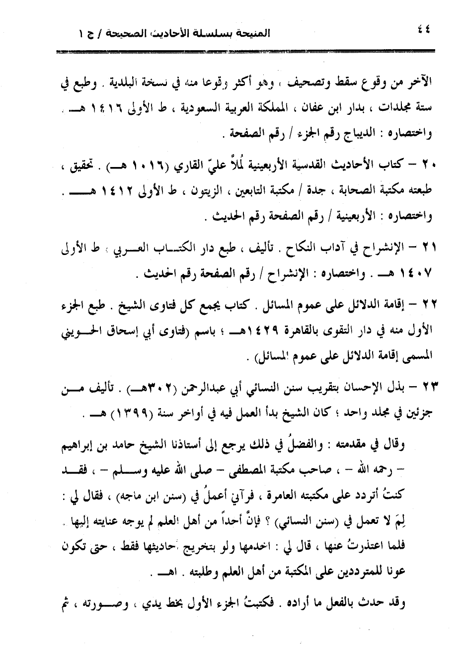 23 - بذل الإحسان بتقريب سنن النسائي أبي عبد الرحمن (302 هـ). تأليف من جزئين في مجلد واحد؛ كان الشيخ بدأ العمل فيه في أواخر سنة (1399) هـ.