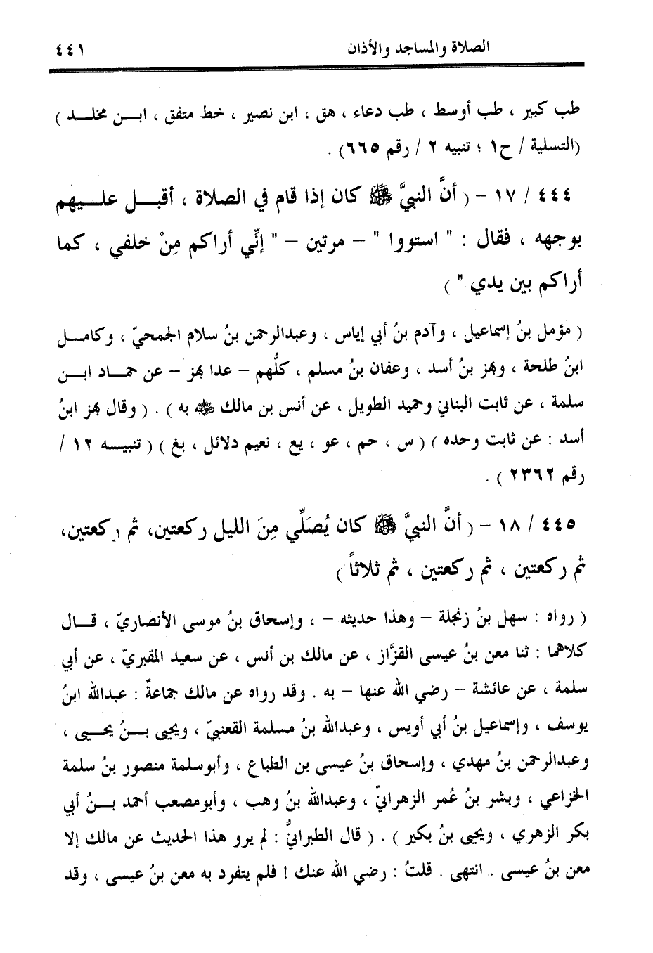 444/ 17 - (أنَّ النبيَّ - صلى الله عليه وسلم - كان إذا قام في الصلاة، أقبل عليهم بوجهه، فقال: "استووا" -مرتين- "إنِّي أراكم مِنْ خلفي، كما أراكم بين يدي").