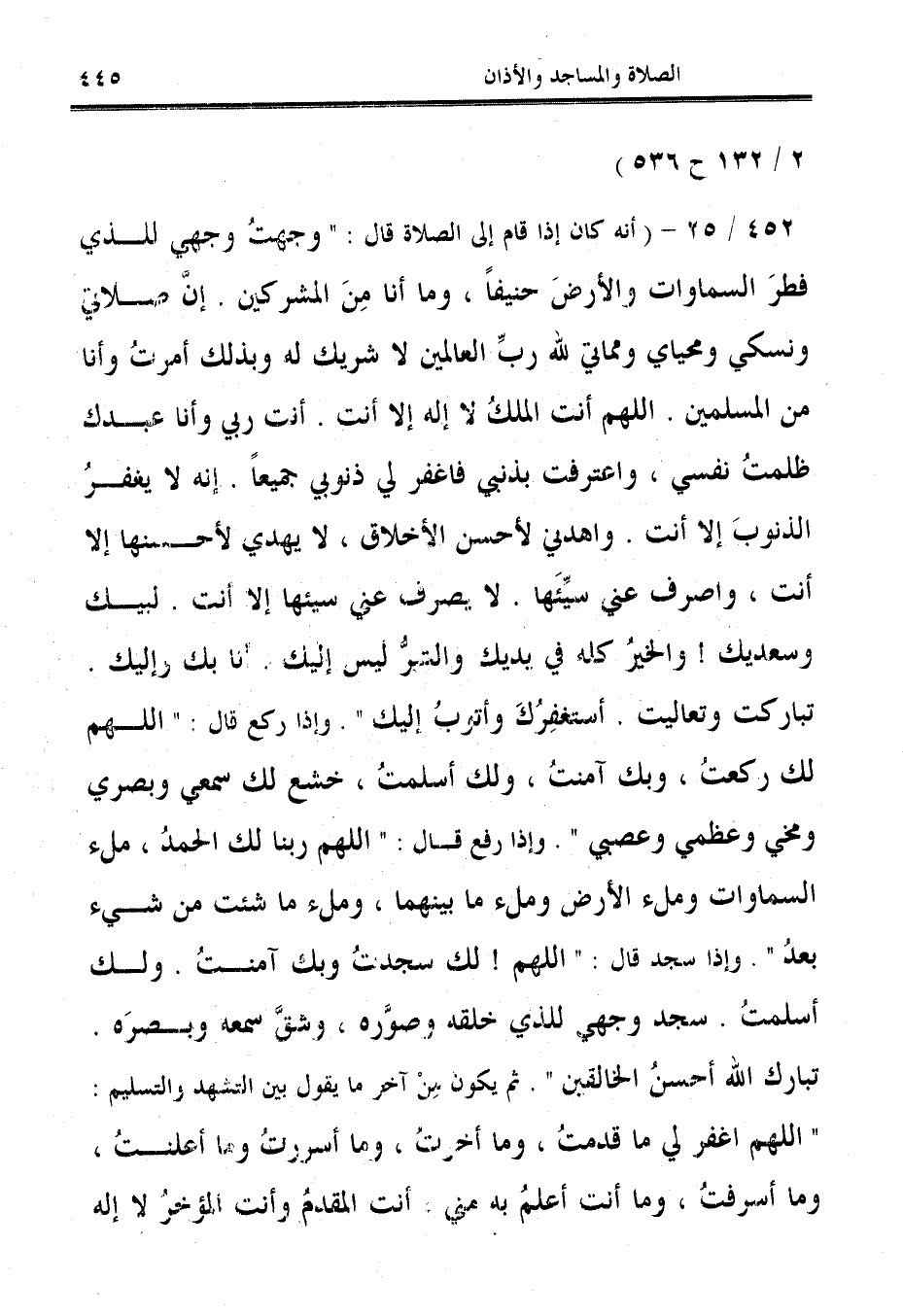 452/ 25 - (أنه كان إذا قام إلى الصلاة قال: "وجهتُ وجهي للذي فطرَ السماوات والأرضَ حنيفًا، وما أنا مِنَ المشركين. إنَّ صلاتي ونسكي ومحياي ومماتي لله ربِّ العالمين لا شريك له وبذلك أمرتُ وأنا من المسلمين. اللهم أنت الملكُ لا إله إلا أنت. أنت ربي وأنا عبدك ظلمتُ نفسي، واعترفت بذنبي فاغفر لي ذنوبي جميعًا. إنه لا يغفرُ الذنوبَ إلا أنت. واهدني لأحسن الأخلاق، لا يهدي لأحسنها إلا أنت، واصرف عني سيِّئَها. لا يصرف عني سيئها إلا أنت. لبيك وسعديك! والخيرُ كله في يديك والشرُّ ليس إليك أنا بك وإليك. تباركت وتعاليت. أستغفِرُكَ وأتوبُ إليك". وإذا ركع قال: "اللهم لك ركعتُ، وبك آمنتُ، ولك أسلمتُ، خشع لك سمعي وبصري ومخي وعظمي وعصبي". وإذا رفع. قال: "اللهم ربنا لك الحمدُ، ملء السماوات وملء الأرض وملء ما بينهما، وملء ما شئت من شيء بعدُ". وإذا سجد قال: "اللهم! لك سجدتُ وبك آمنتُ. ولك أسلمتُ. سجد وجهي للذى خلقه وصوَّره، وشقَّ سمعه وبصرَه. تبارك الله أحسنُ الخالقين". ثم يكون مِن آخر ما يقول بين التشهد والتسليم: "اللهم اغفر لي ما قدمتُ، وما أخرت، وما أسررتُ وما أعلنتُ، وما أسرفت، وما أنت أعلمُ به مني, أنت المقدمُ وأنت المؤخر لا إله