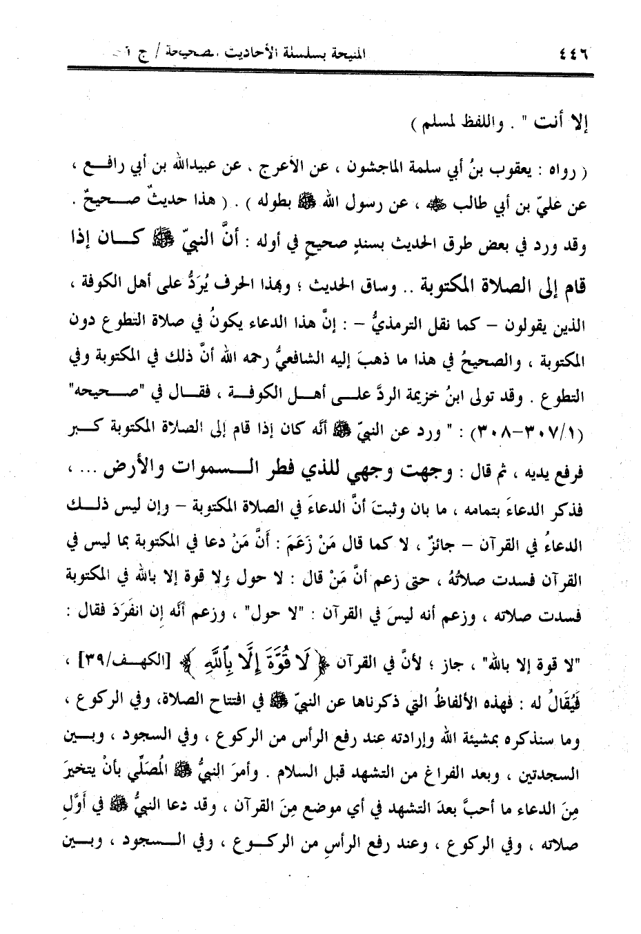 (رواه: يعقوب بنُ أبي سلمة الماجشون، عن الأعرج، عن عبيد الله بن أبي رافع، عن عليّ بن أبي طالب - رضي الله عنه -، عن رسول الله - صلى الله عليه وسلم - بطوله). (هذا حديثٌ صحيحٌ. وقد ورد في بعض طرق الحديث بسندٍ صحيحٍ في أوله: أنَّ النبيّ - صلى الله عليه وسلم - كان إذا قام إلى الصلاة المكتوبة .. وساق الحديث؛ وبهذا الحرف يُرَدُّ على أهل الكوفة، الذين يقولون -كما نقل الترمذي-: إن هذا الدعاء يكونُ في صلاة التطوع دون المكتوبة، والصحيحُ في هذا ما ذهبَ إليه الشافعيُّ رحمه الله أنَّ ذلك في المكتوبة وفي التطوع. وقد تولى ابنُ خزيمة الردَّ على أهل الكوفة، فقال في "صحيحه" (1/ 307 - 308): "ورد عن النبيّ - صلى الله عليه وسلم - أنَّه كان إذا قام إلى الصلاة المكتوبة كبر فرفع يديه، ثم قال: وجهت وجهي للذي فطر السموات والأرض ... ، فذكر الدعاءَ بتمامه، ما بان وثبتَ أنَّ الدعاءَ في الصلاة المكتوبة -وإن ليس ذلك الدعاءُ في القرآن- جائزٌ، لا كما قال مَنْ زَعَمَ: أَنَّ مَن دعا في المكتوبة بما ليس في القرآن فسدت صلاتُهُ، حتى زعم أنَّ مَنْ قال: لا حول ولا قوة إلا بالله في المكتوبة فسدت صلاته، وزعم أنه ليسَ في القرآن: "لا حول"، وزعم، أنَّه إِن انفَرَدَ فقال: "لا قوة إلا بالله"، جاز؛ لأنَّ في القرآن {لَا قُوَّةَ إلا بِاللَّهِ} [الكهف: 39] , فَيُقَالُ له: فهذه الألفاظُ التي ذكرناها عن النبيّ - صلى الله عليه وسلم - في افتتاح الصلاة، وفي الركوع, وما سنذكره بمشيئة الله وإرادتهُ عند رفع الرأس من الركوع، وفي السجود، وبين السجدتين، وبعد الفراغ من التشهد قبل السلام. وأمرَ النبيُّ - صلى الله عليه وسلم - المُصَلِّي بأنْ يتخيرَ مِنَ الدعاء ما أحبَّ بعدَ التشهد في أي موضع مِنَ القرآن، وقد دعا النبيُّ - صلى الله عليه وسلم - في أَوَّلِ صلاته، وفي الركوع، وعند رفع الرأسِ من الركوع، وفي السجود، وبين