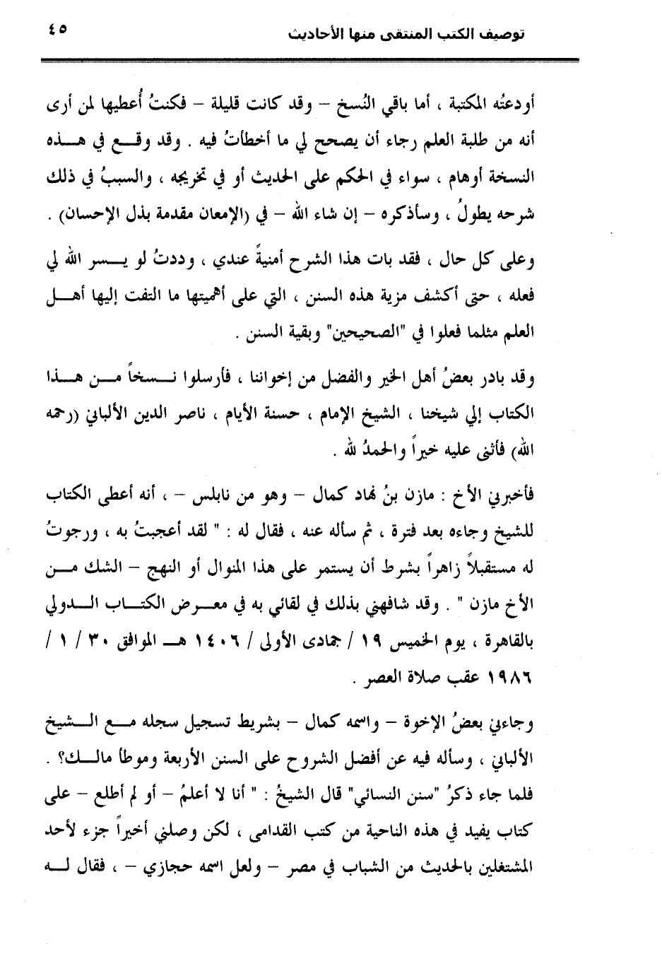 فأخبرني الأخ: مازن بنُ نهاد كمال -وهو من نابلس-، أنه أعطى الكتاب للشيخ وجاءه بعد فترة، ثم سأله عنه، فقال له: "لقد أعجبتُ به، ورجوتُ له مستقبلاً زاهرًا بشرط أن يستمر على هذا المنوال أو المنهج - الشك من الأخ مازن". وقد شافهني بذلك في لقائي به في معرض الكتاب الدولي بالقاهرة، يوم الحميس 19 / جمادى الأولى / 1406 هـ الموافق 30/ 1 / 1986 عقب صلاة العصر.