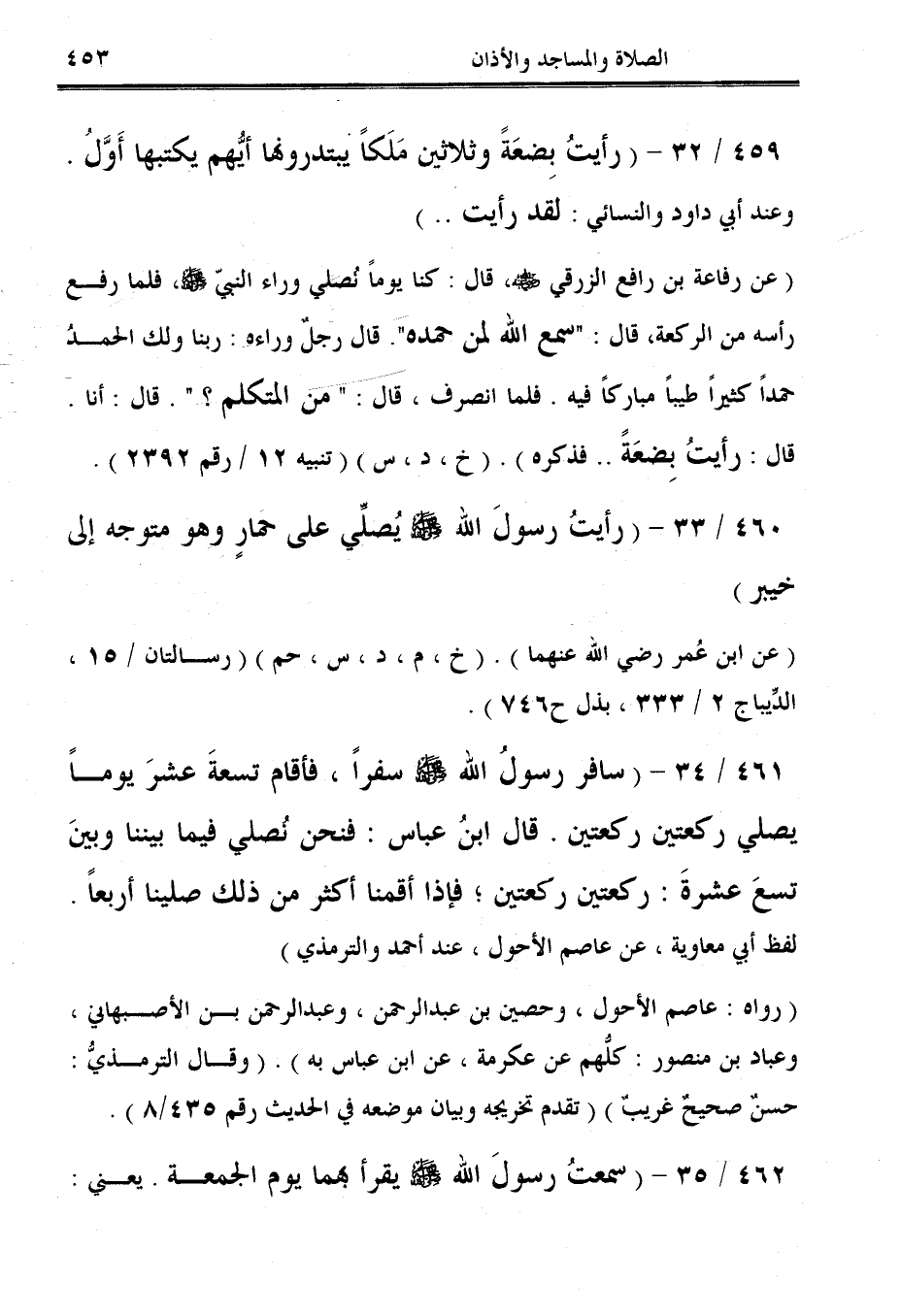 460/ 33 - (رأيتُ رسولَ الله - صلى الله عليه وسلم - يُصلِّي على حمارٍ وهو متوجه إلى خيبر) (عن ابن عُمر رضي الله عنهما). (خ، م، د، س، حم) (رسالتان / 15، الدِّيباج 2/ 333، بذل ح 746).