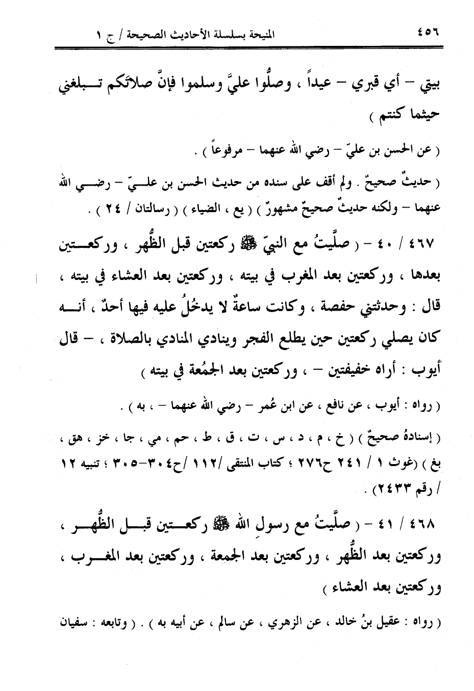 468/ 41 - (صلَّيتُ مع رسولِ الله - صلى الله عليه وسلم - ركعتين قبل الظُّهر، وركعتين بعد الظُّهر، وركعتين بعد الجمعة، وركعتين بعد المغرب، وركعتين بعد العشاء).