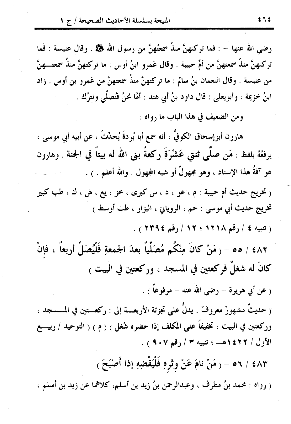 482/ 55 - (مَنْ كانَ مِنْكم مُصَلِّيًا بعدَ الجمعةِ فَلْيُصَلِّ أربعًا، فإنْ كانَ له شغلٌ فركعتين في المسجد، وركعتين في البيت).