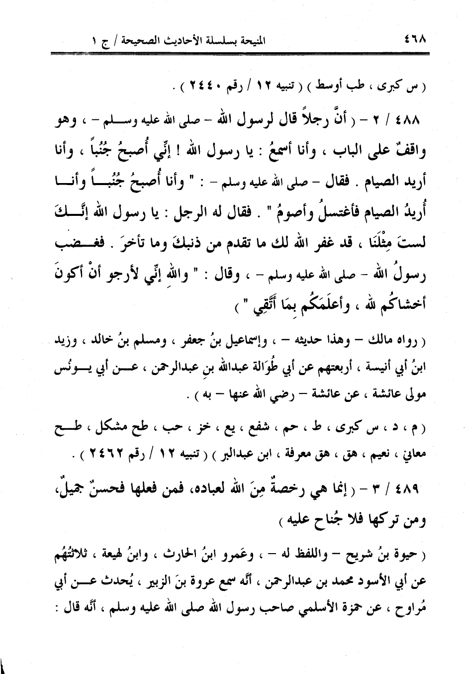 488/ 2 - (أنَّ رجلًا قال لرسول الله - صلى الله عليه وسلم -، وهو واقفٌ على الباب، وأنا أسمعُ: يا رسول الله! إنِّي أُصبحُ جُنُبًا، وأنا أريد الصيام. فقال - صلى الله عدية وسلم -: "وأنا أُصبح جُنُبًا وأنا أُريدُ الصيام فأغتسلُ وأصومُ". فقال له الرجل: يا رسول الله إنَّكَ لستَ مِثْلَنَا، قد غفر الله لك ما تقدم من ذنبكَ وما تأخرَ. فغضب رسولُ الله - صلى الله عليه وسلم -، وقال: "واللهِ إنِّي لأرجو أنْ أكونَ أخشاكُم لله، وأعلَمَكُم بِمَا أَتَّقِي").