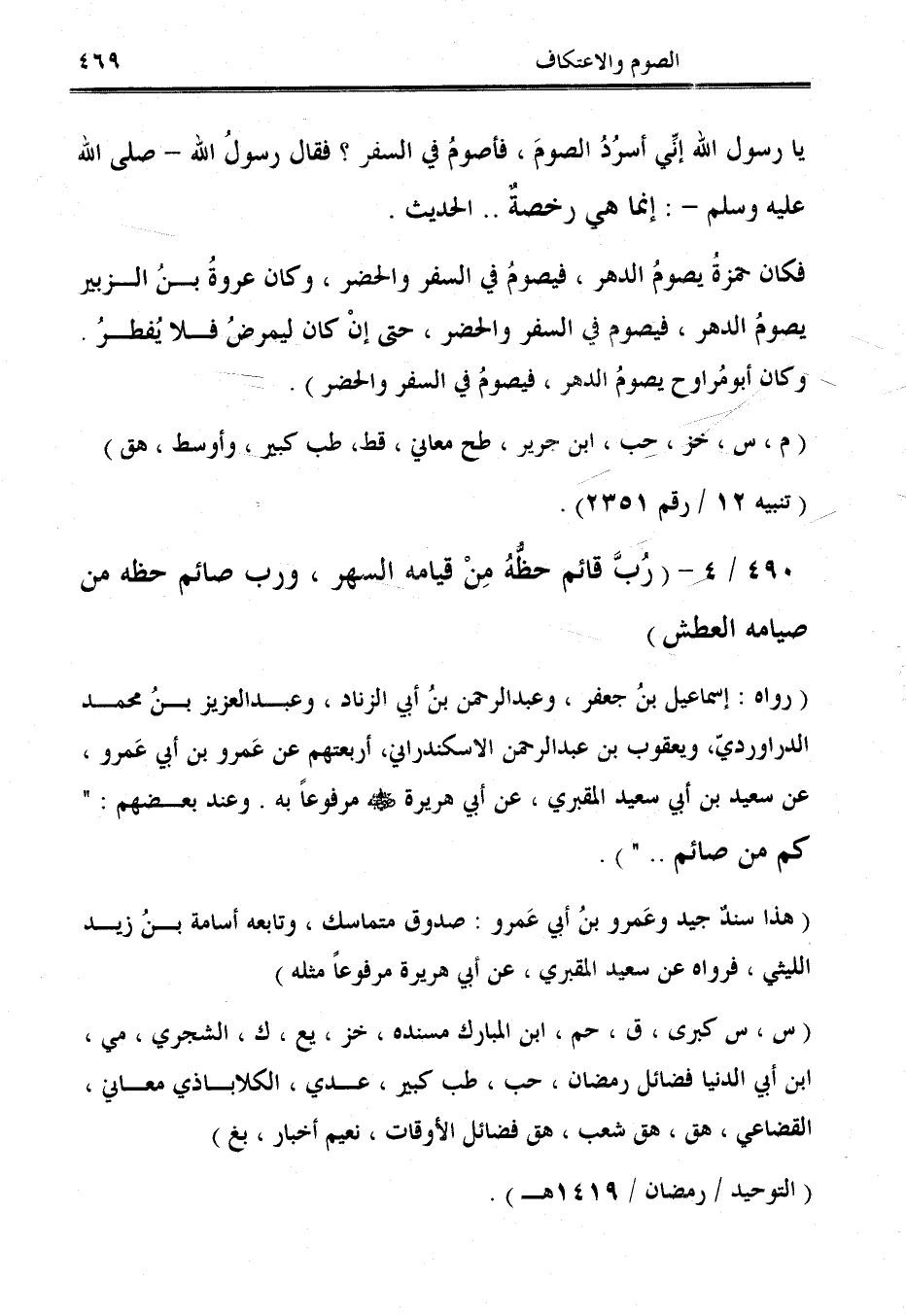 (رواه: إسماعيل بنُ جعفر، وعبد الرحمن بنُ أبي الزناد، وعبد العزيز بنُ محمد الدراورديّ، ويعقوب بن عبد الرحمن الإسكندراي، أربعتهم عن عَمرو بن أبي عَمرو، عن سعيد بن أبي سعيد المقبري، عن أبي هريرة - رضي الله عنه - مرفوعًا به. وعند بعضهم: "كم من صائم .. ").