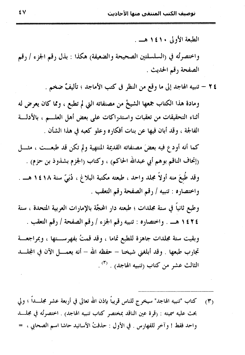 وبقيت ستة مجلدات جاهزة للطبع تمامًا، وقد قمتُ بفهرستها، وبمراجعة تجارب طبعها. وقد أبلغني شيخنا - حفظه الله - أنه يعمل الآن في المجلد الثالث عشر من كتاب (تنبيه الهاجد) (¬3).