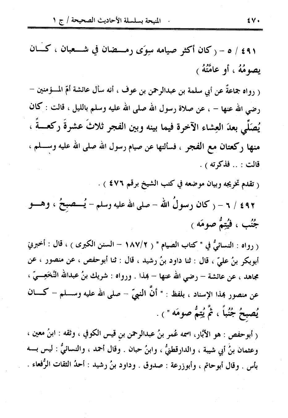 (رواه: النسائيُّ في "كتاب الصيام" (2/ 187 - السنن الكبرى)، قال: أخبرني أبو بكر بنُ عليّ، قال: ثنا داود بنُ رشيد، قال: ثنا أبو حفص، عن منصور، عن مجاهد، عن عائشة - رضي الله عنها - بهذا. ورواه: شريك بنُ عبد الله النَّخَعِيّ، عن منصور بهذا الإسناد، بلفظ: "أنَّ النبيّ - صلى الله عليه وسلم - كان يُصبِحُ جُنُبًا، ثم يُتمُّ صومَه").