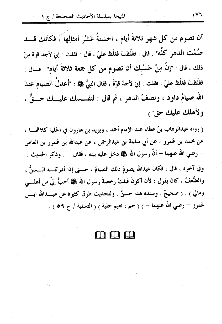 أن تصوم من كل شهر ثلاثةَ أيام، الحسنةُ عَشْرَ أمثالِهَاَ، فكأنك قد صُمْتَ الدهر كلَّه". قال: فغَلَّظتُ فغلَّظ عليّ، قال: فقلت: إني لأجد قوة مِنْ ذلك، قال: "إنَّ مِنْ حَسْبِك أن تصوم من كل جمعة ثلاثةَ أيام". قال: فغَلَّظتُ فغلَّظ عليّ، فقلت: إني لأجدُ قوّةً، فقال النبيُّ - صلى الله عليه وسلم -: "أعدلُ الصيام عندَ الله صيامُ داود، ونصفُ الدهر، ثم قال: لنفسك عليك حقٌّ، ولأهلك عليك حق").