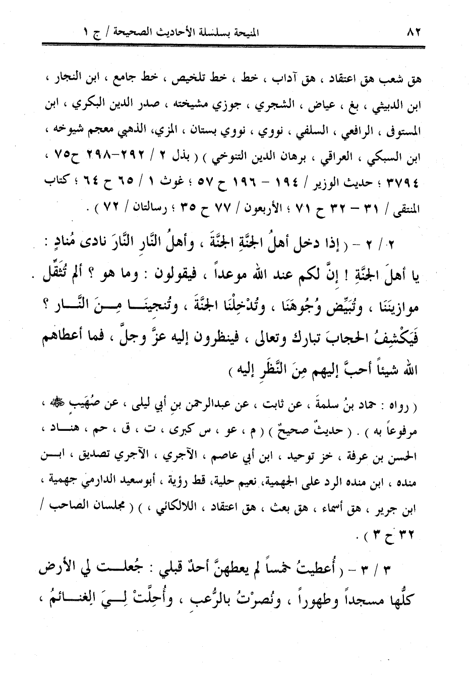 (رواه: حماد بنُ سلمةَ، عن ثابت، عن عبد الرحمن بنِ أبي ليلى، عن صُهَيبٍ - رضي الله عنه -، مرفوعًا به). (حديثٌ صحيحٌ) (م، عو، س كبرى، ت، ق، حم، هناد، الحسن بن عرفة، خز توحيد، ابن أبي عاصم، الآجري، الآجري تصديق، ابن منده، ابن منده الرد على الجهمية، نعيم حلية، قط رؤية، أبو سعيد الدارمي جهمية، ابن جرير، هق أسماء، هق بعث، هق اعتقاد، اللالكائي) (مجلسان الصاحب / 32 ح 3).