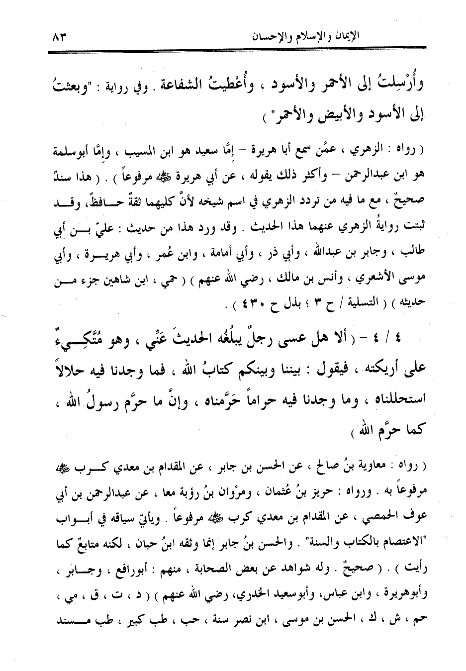 4/ 4 - (ألا هل عسى رجلٌ يبلُغه الحديثَ عَنِّي، وهو مُتَّكِيءٌ على أريكته، فيقول: بيننا وبينكم كتابُ الله، فما وجدنا فيه حلالاً استحللناه، وما وجدنا فيه حرامًا حَرَّمناه، وإنَّ ما حرَّم رسولُ الله، كما حرِّم الله).