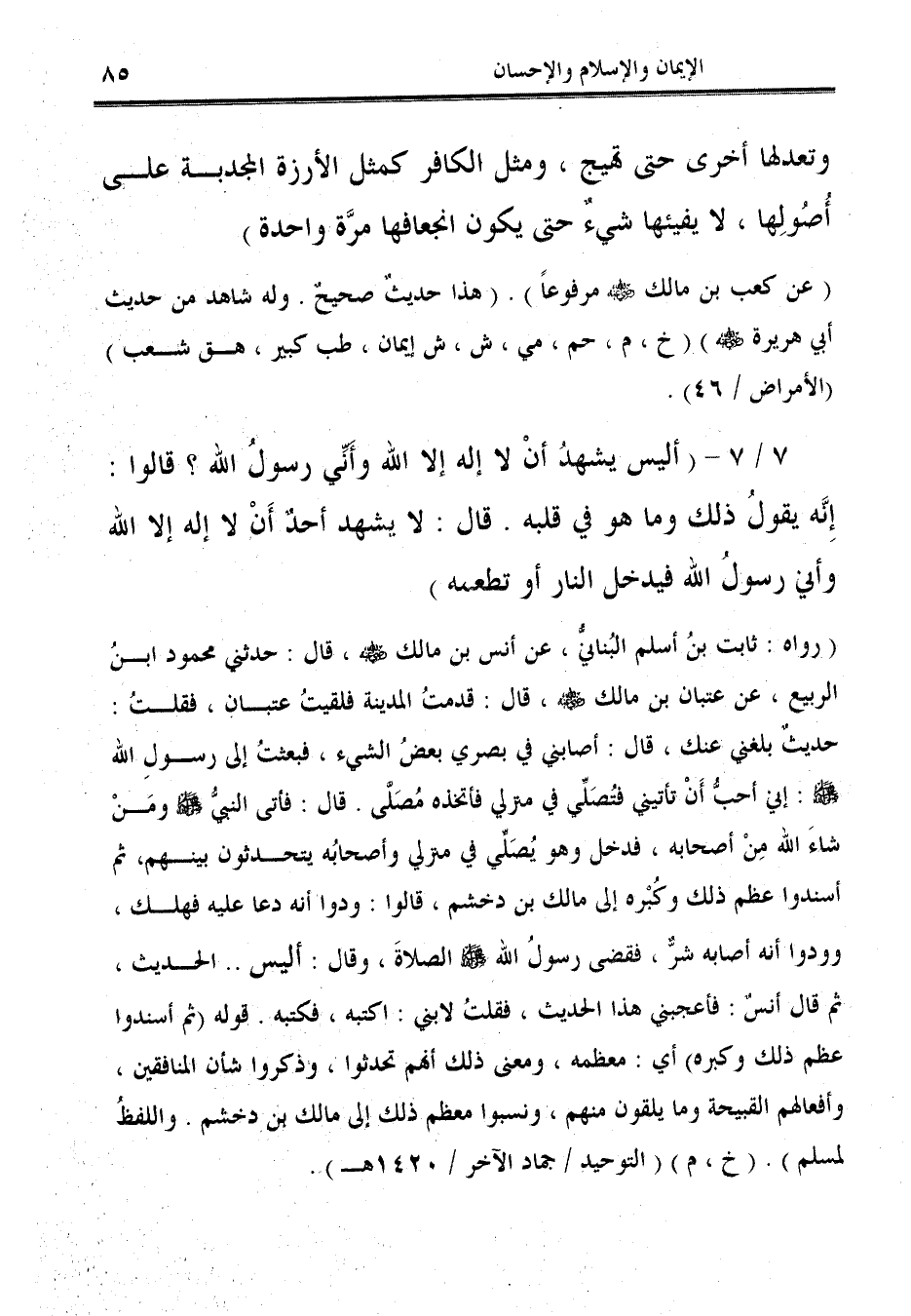 7/ 7 - (أليس يشهدُ أنْ لا إله إلا الله وأَني رسولُ الله؟ قالوا: إِنَّه يقولُ ذلك وما هو في قلبه. قال: لا يشهد أحدٌ أَنْ لا إله إلا الله وأني رسولُ الله فيدخل النار أو تطعمه).