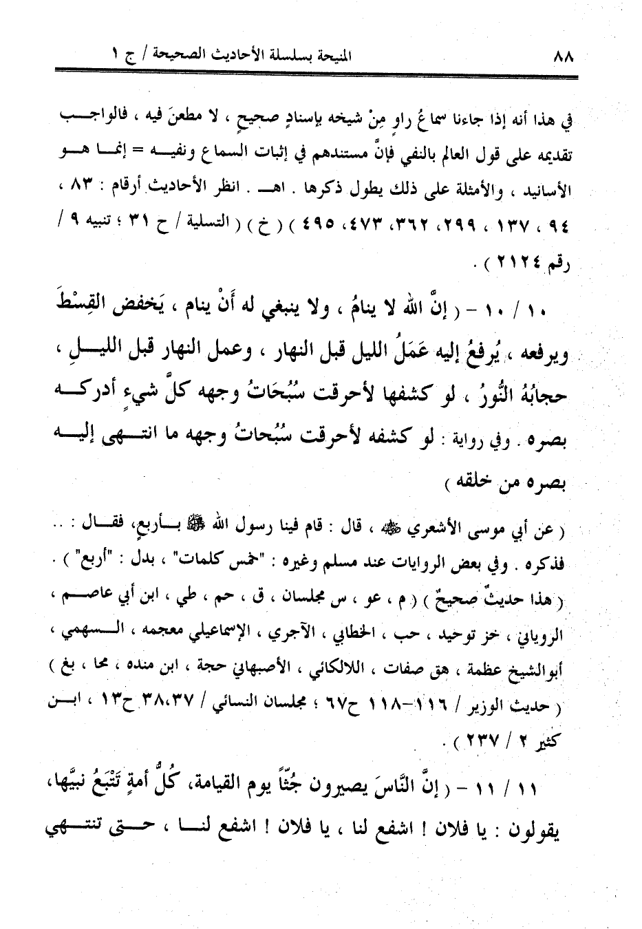 (هذا حديثٌ صحيحٌ) (م، عو، س مجلسان، ق، حم، طي، ابن أبي عاصم، الروياني، خز توحيد، حب، الخطابي، الآجري، الإسماعيلي معجمه، السهمي، أبو الشيخ عظمة، هق صفات، اللالكائي، الأصبهاني حجة، ابن منده، محا، بغ) (حديث الوزير / 116 - 118 ح 67؛ مجلسان النسائي / 37، 38 ح 13، ابن كثير 2/ 237).