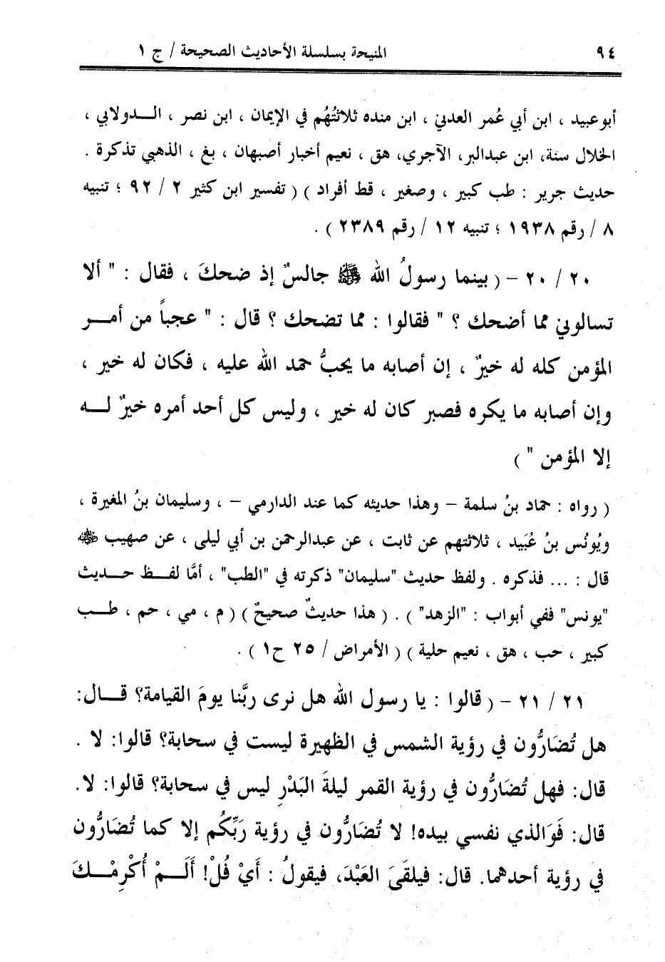 21/ 21 - (قالوا: يا رسول الله هل نرى ربَّنا يومَ القيامة؟ قال: هل تُضَارُّون في رؤية الشمس في الظهيرة ليست في سحابة؟ قالوا: لا. قال: فهل تُضَارُّون في رؤية القمر ليلةَ البَدْرِ ليس في سحابة؟ قالوا: لا. قال: فَوَالذي نفسي بيده! لا تُضَارُّون في رؤية رَبِّكُم إلا كما تُضَارُّون في رؤية أحدهما. قال: فيلقَىَ العَبْدَ، فيقولُ: أَيْ فُلْ! أَلَمْ أُكْرِمْكَ