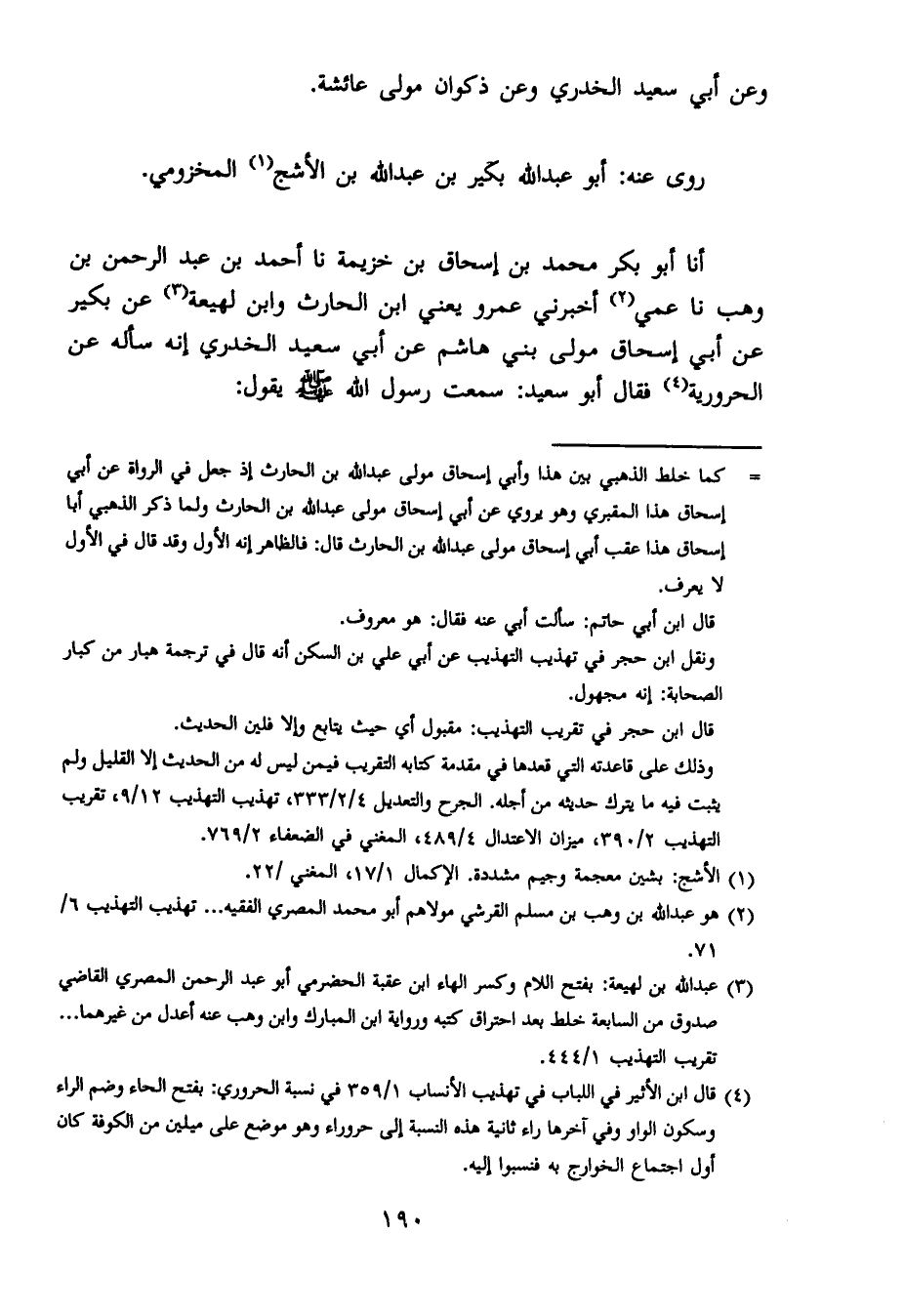 أخبرنا أبو بكر محمد بن إسحاق بن خزيمة ، حَدَّثنا أحمد بن عبد الرحمن بن وَهب ، حَدَّثنا عمي أخبرني عَمْرو ، يَعنِي ابن الحارث ، وَابن لهيعة عن بكير عن أبي إسحاق مولى بني هاشم عن أبي سعيد الخدري إنه سأله عن الحرورية فقال أبو سعيد : سمعت رسول الله صلى الله عليه وسلم يقول : يخرج أقوام يقولون الحق بألسنتهم لا يجاوز تراقيهم يمرقون من الدين كما يمرق السهم من الرمية ينظر في نصله فلا يرى شيئًا فلا يتعلقون من الدين بشيء إلا كما يتعلق به ذلك السهم.