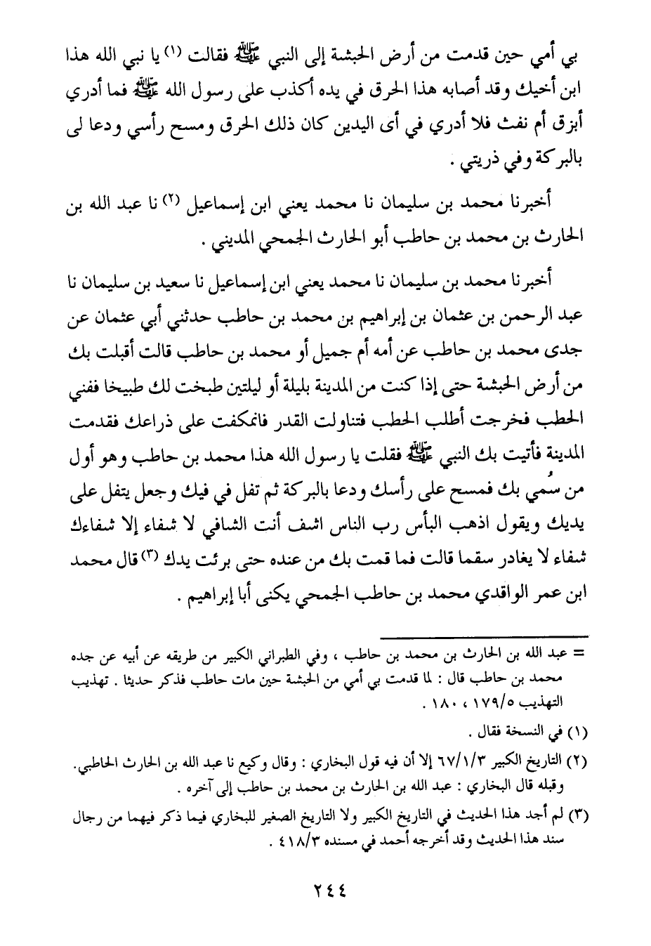 أخبرنا محمد بن سُليمان ، حَدَّثنا محمد ، يَعنِي ابن إسماعيل ، حَدَّثنا سعيد بن سليماتن ، حَدَّثنا عبد الرحمن بن عثمان بن إبراهيم بن محمد بن حاطب حدثني أبي عثمان عن جدي محمد بن حاطب عن أمه أم جميل أو محمد بن حاطب قالت أقبلت بك من أرض الحبشة حتى إذا كنت من المدينة بليلة أو ليلتين طبخت ففنى الحطب فخرجت أطلب الحطب فتناولت القدر فانمكفت على ذراعك فقدمت المدينة فأتيت بك النبي صلى الله عليه وسلم فقلت يارسول الله هذا محمد بن حاطب ، وَهُو أول من سمي بك فمسح على رأسك ، وَدعا بالبركة ثم تفل في فيك ، وَجعل يتفل غلى يديك ، وَيقول اذهب البأس رب الناس اشف أنت الشافي لا شفاء إلا شفاءك شفاء لا يغادر سقما قالت فما قمت بك من عنده حتى برئت يدك قال محمد بن عُمَر الواقدي محمد بن حاطب الجمحي يكنى أبا إبراهيم.