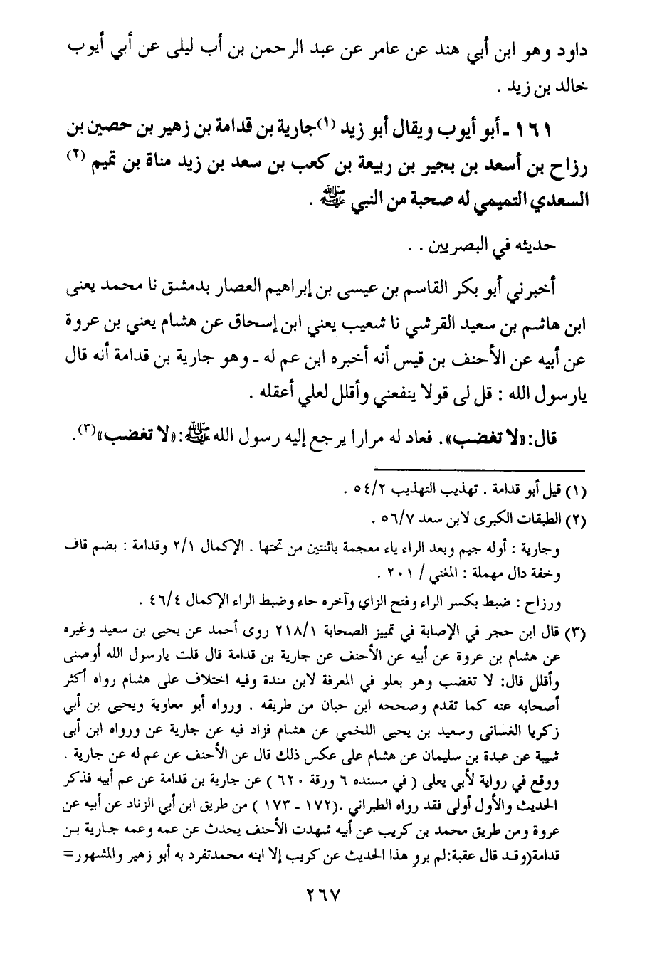 أخبرني أبو بكر القاسم بن عيسى بن إبراهيم العصار بدمشق ، حَدَّثنا محمد ، يَعنِي ابن هاشم بن سعيد القرشي ، حَدَّثنا شعيب ، يَعنِي ابن إسحاق عن هشام ، يَعني ابن عروة ، عَن أبيه عن الأحنف بن قيس أنه أخبره ابن عم - ، وَهُو جارية بن قدامة أنه قال يارسول الله : قل لي قولا ينفعني وأقلل لعلي أعقله.