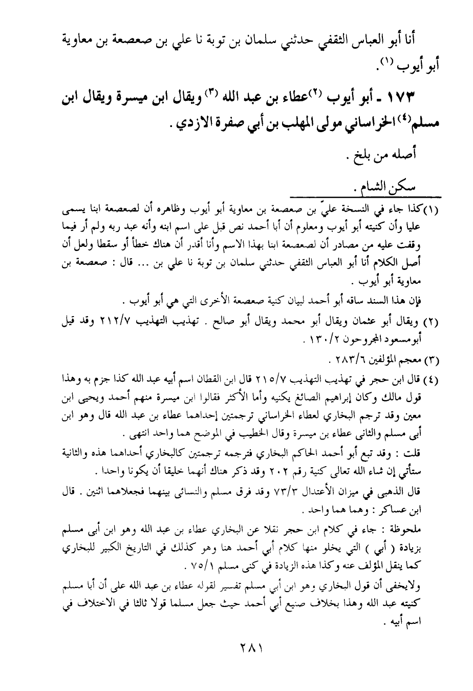 173- أبو أيوب عطاء بن عبد الله ، وَيُقَال : ابن ميسرة ، وَيُقَال : ابن مسلم الخراساني مولى المهلب بن أبي صفرة الازدي.