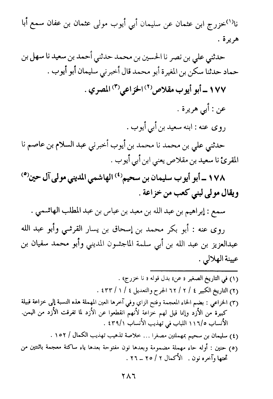 178- أبو أيوب سُليمان بن سحيم الهاشمي المديني مولى آل حين ، وَيُقَال : مولى لبني كعب من خزاعة.