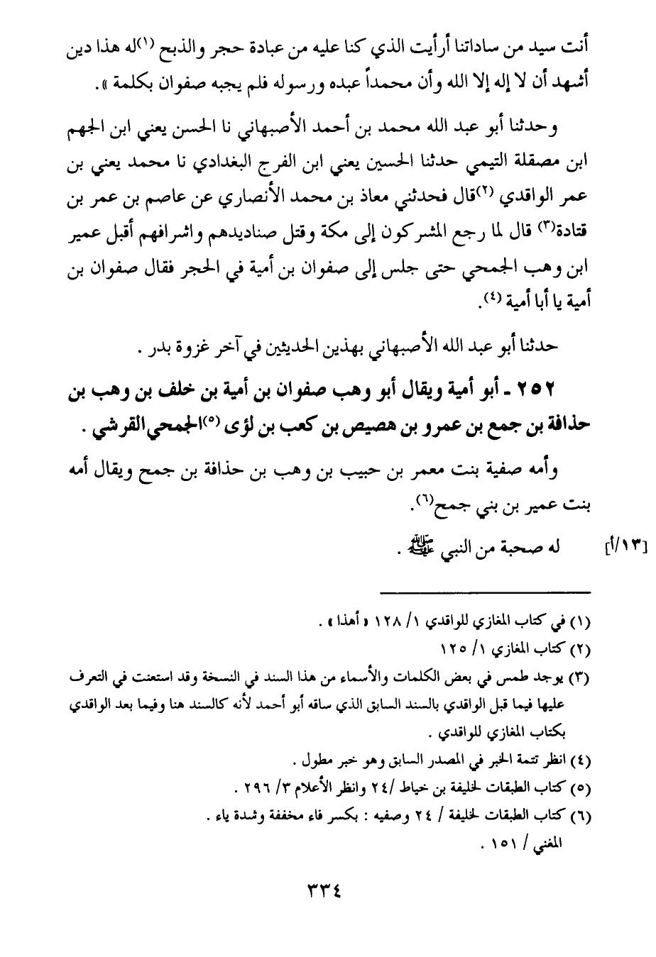 وحدثنا أبو عبد الله محمد بن أحمد الأصبهاني ، حَدَّثنا الحسن ، يَعنِي ابن الجهم بن مصقلة التيمي حدثنا الحسين ، يَعنِي ابن الفرج البغدادي ، حَدَّثنا محمد ، يَعنِي ابن عُمَر الواقدي قال فحدثني معاذ بن محمد الأنصاري عن عاصم بن عُمَر بن قتادة قال لما رجع المشركون إلى مكة وقتل صناديدهم واشرافهم أقبل عُمَير بن عُمَير الجمحي حتى جلس إلى صفوان بن أمية في الحجر فقال صفوان بن أمية ياأبا أمية.