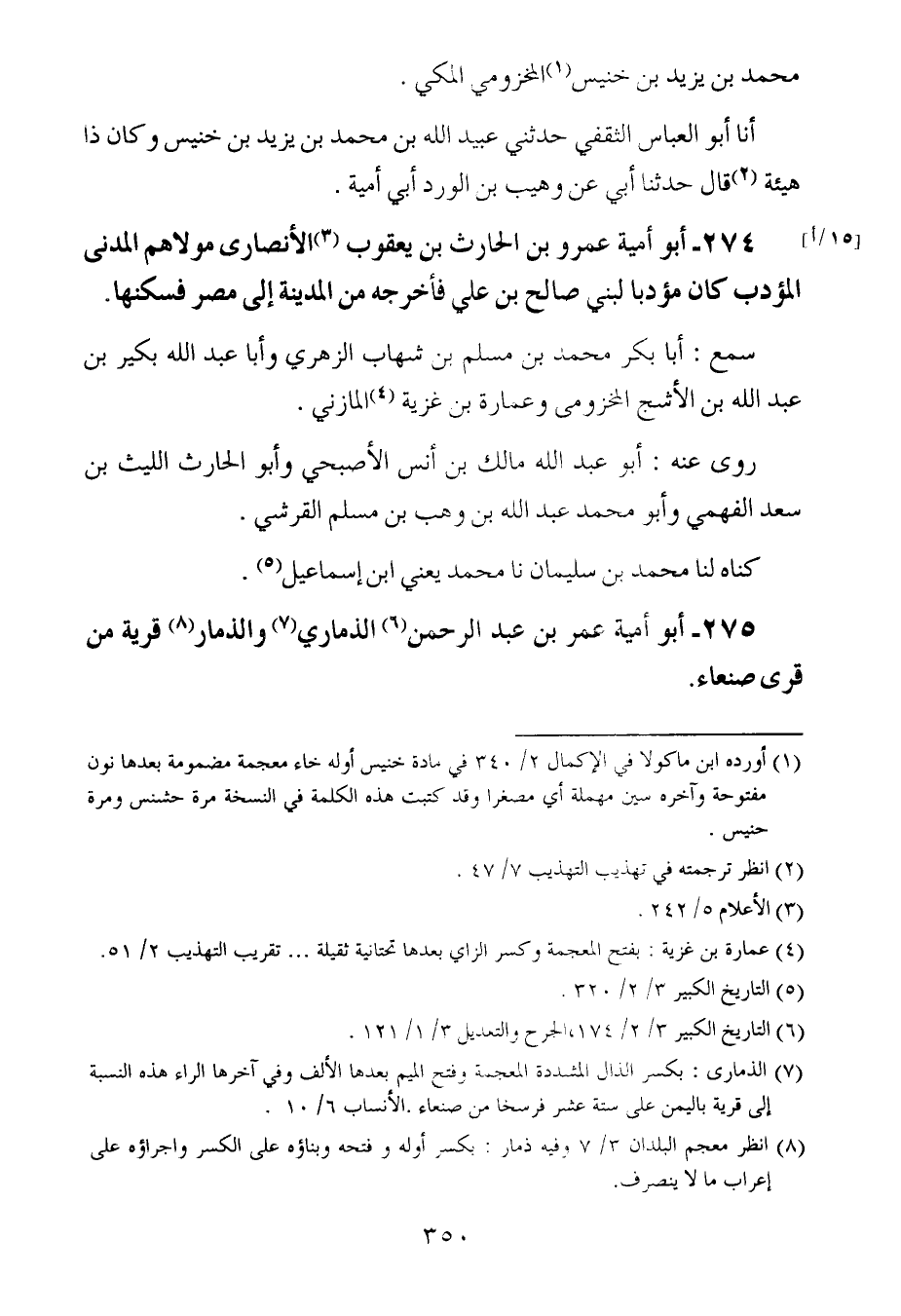 275- أبو أمية عُمَر بن عبد الرحمن الذماري والذمار قرية من قرى صنعاء.