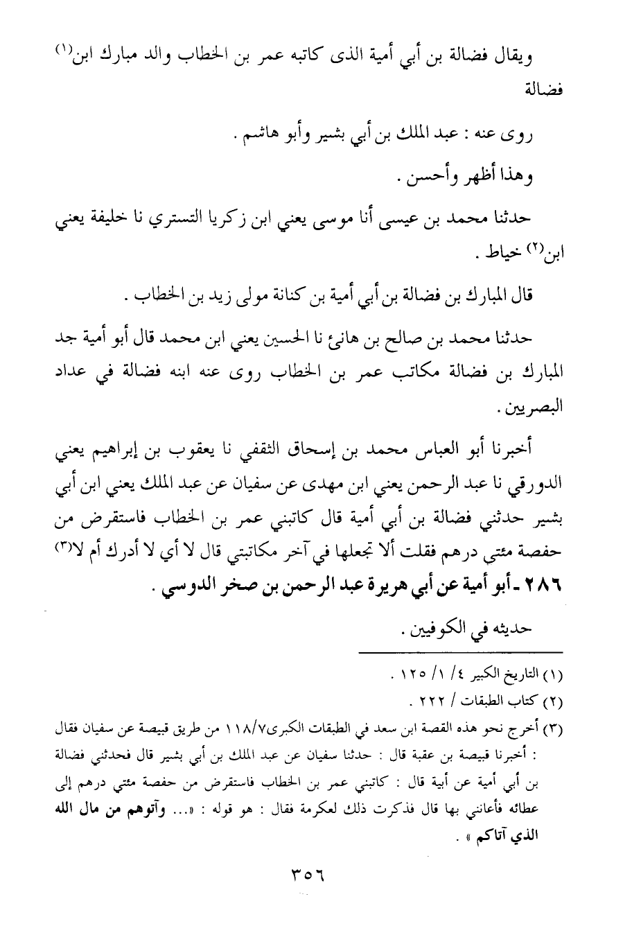حدثنا محمد بن صالح بن هانِئ ، حَدَّثنا الحسين ، يَعنِي ابن محمد قال أبو أمية جد المبارك بن فضالة مكاتب عُمَر بن الخطاب رَوَى عَنه ابنه فضالة في عداد البصريين.