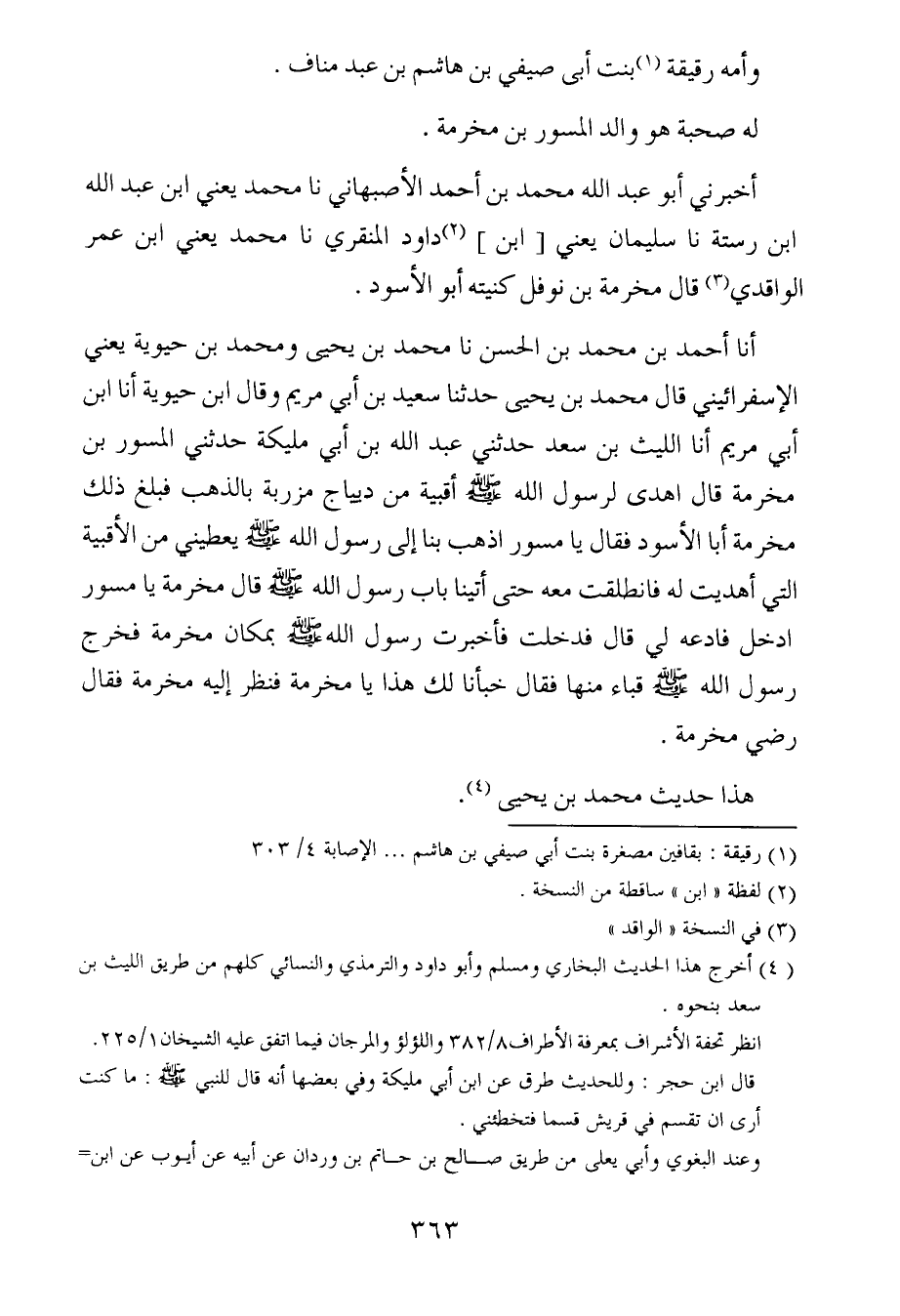 وقال ابن حيوية ، أَخْبَرنا ابن أبي مريم ، أَخْبَرنا الليث بن سعد حدثني عبد الله بن أبي مليكة حدثني المسور بن مخرمة قال أهدى لرسول الله صلى الله عليه وسلم أقبية من ديباج مزربة بالذهب فبلغ ذلك مخرمة أبا الأسود فقال يامسور اذهب بنا إلى رسول الله صلى الله عليه وسلم يعطيني من الأقبية التي أهديت له فانطلقت معه حتى أتينا باب رسول الله صلى الله عليه وسلم قال مخرمة يامسور ادخل فادعه لي قال فدخلت فأخبرت رسول الله صلى الله عليه وسلم بمكان مخرمة فخرج رسول الله صلى الله عليه وسلم قباء منها فقال خبأنا لك هذا يامخرمة فنظر إليه مخرمة فقال رضي مخرمة.