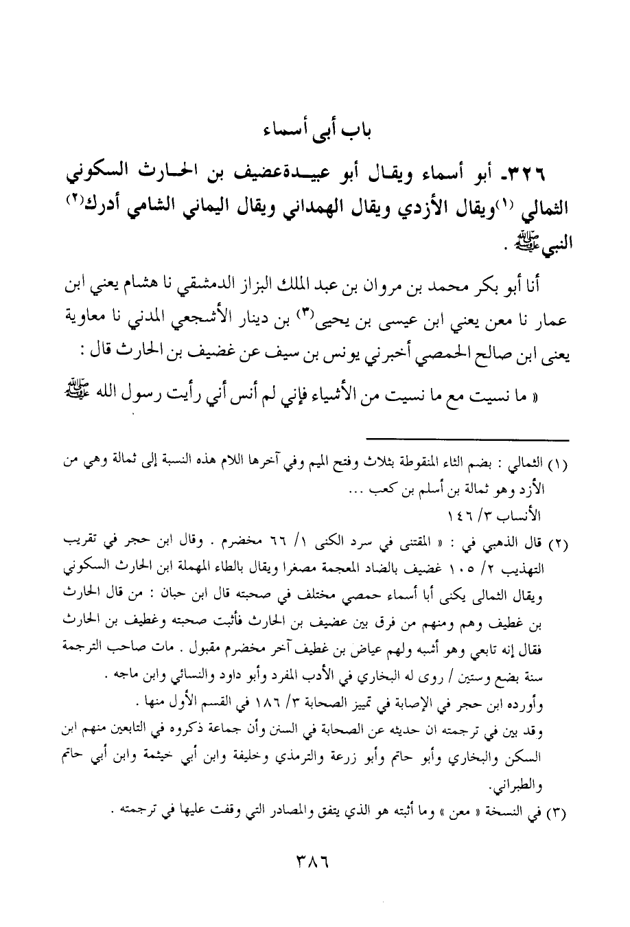 326- أبو أسماء ، وَيُقَال : أبو عبيدة عضيف بن الحارث السكوني الثمالي ، وَيُقَال : ، الأَزدِيّ ، وَيُقَال : الهمداني ، وَيُقَال : اليماني الشامي أدرك النبي صلى الله عليه وسلم.
