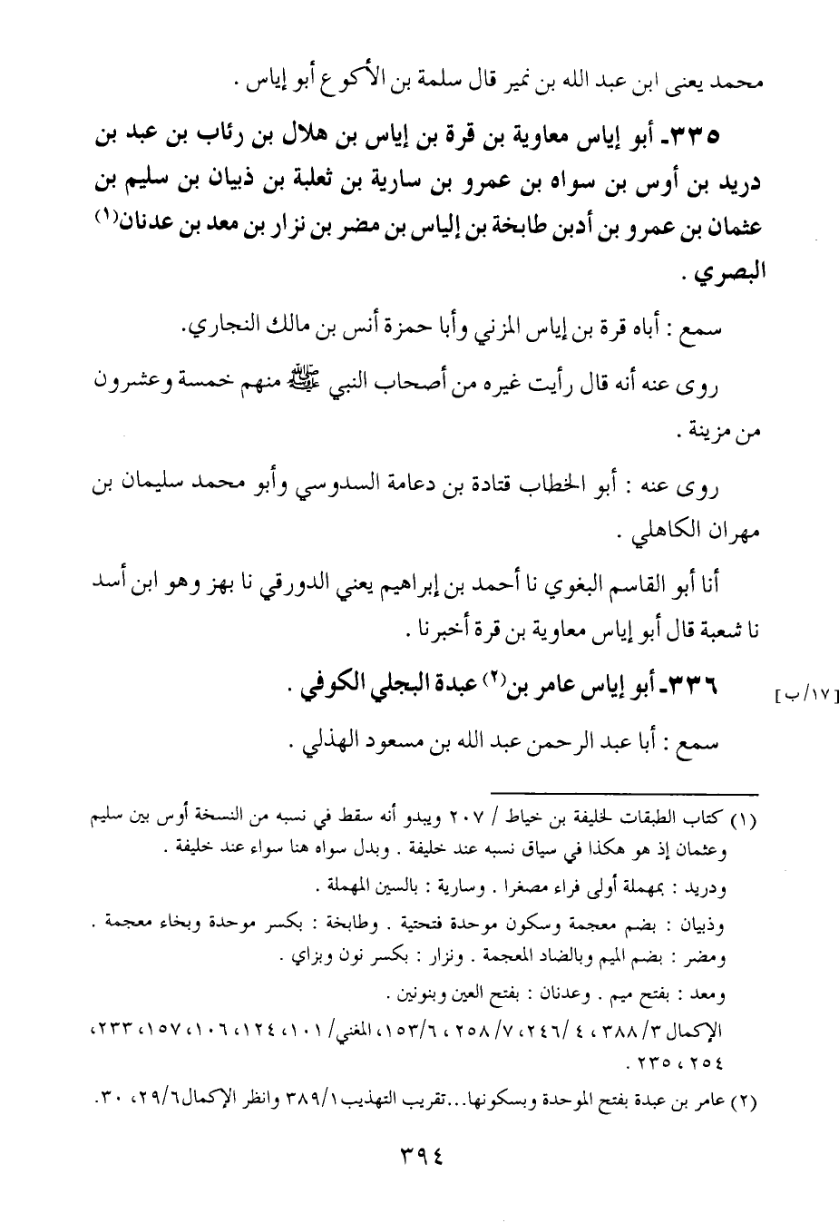 335- أبو إياس معاوية بن قرة بن إياس بن هلال بن رئاب بن عبد بن دريد بن أوس بن سواه بن عَمْرو بن سارية بن ثعلبة بن ذبيان بن سليم بن عثمان بن عَمْرو بن أدبن طابخة بن إلياس بن مضر بن نزار بن معد بن عدنان البصري.