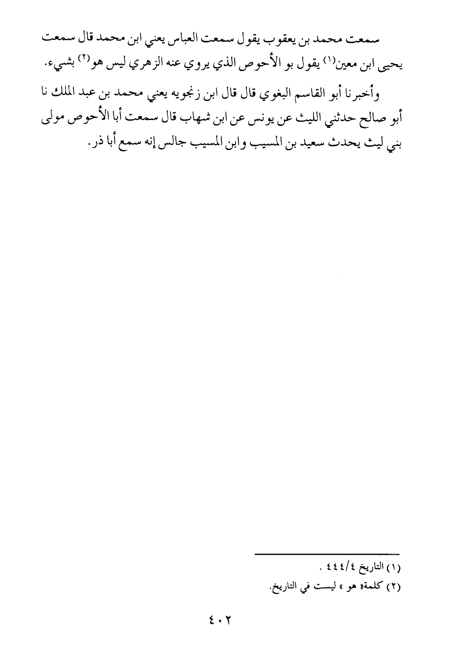 وأخبرنا أبو القاسم البغوي ، قال : قال ابن زَنْجَوَيْهِ ، يَعني محمد بن عبد الملك ، حَدَّثنا أبو صالح حدثني الليث عن يونس عن ابن شهاب ، قال : سَمِعتُ أبا الأحوص مولى بني ليث يحدث سعيد بن المُسَيَّب وابن المُسَيَّب جالس إنه سمع أبا ذر.